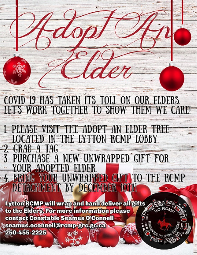 The initiative is called ‘Adopt an Elder’. Local elders or seniors — or people who know them — are asked to fill out a holiday wish list and return to the Lytton RCMP detachment before December 1.
