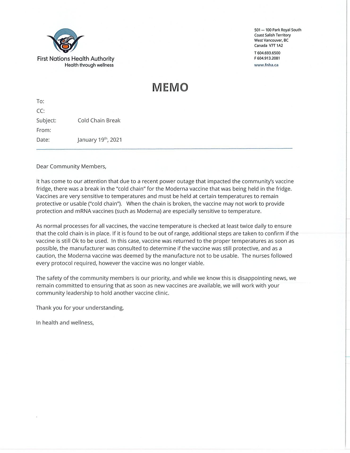 According to the memo, a power outage that knocked out the community’s vaccine fridge broke the “cold chain” necessary for the survival of the Moderna vaccine.
