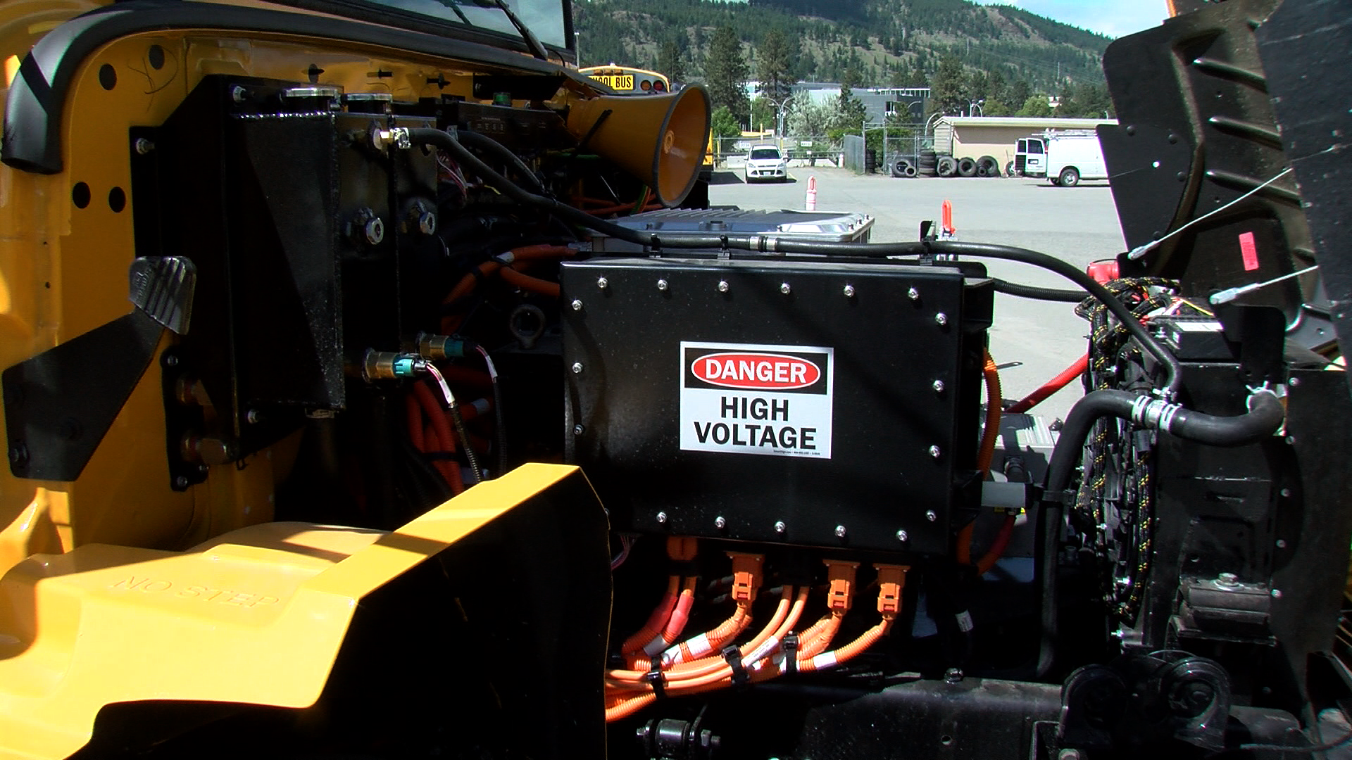 A look underneath the hood of School District 73’s first electric school bus (Image Credit: CFJC Today)