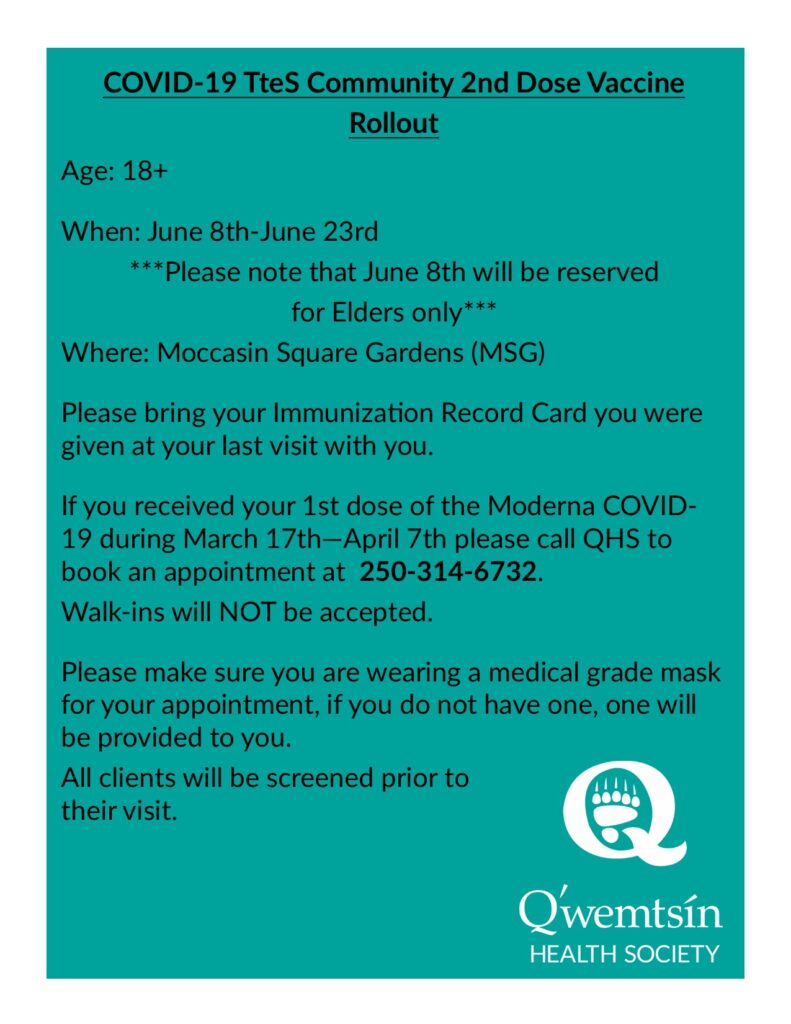 TK’EMLUPS — Second-dose COVID-19 vaccinations began Tuesday (June 8) for members of the Tk’emlups te Secwepemc.
