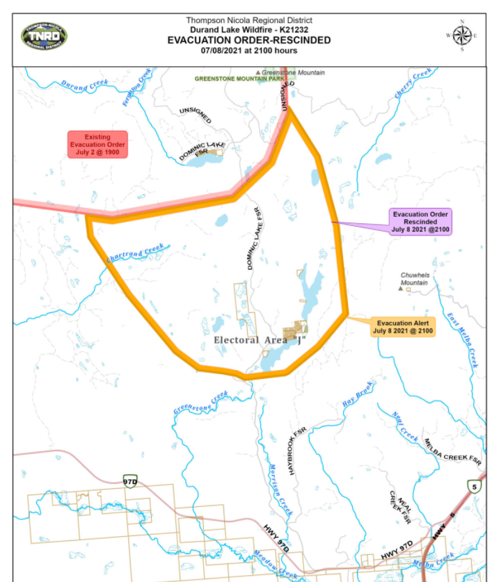 The Thompson-Nicola Regional District announced late Thursday (July 8) evacuation orders for 95 properties around the Durand Lake wildfire have been downgraded to alerts. Residents were allowed to return home as of 9:00 p.m. Thursday.