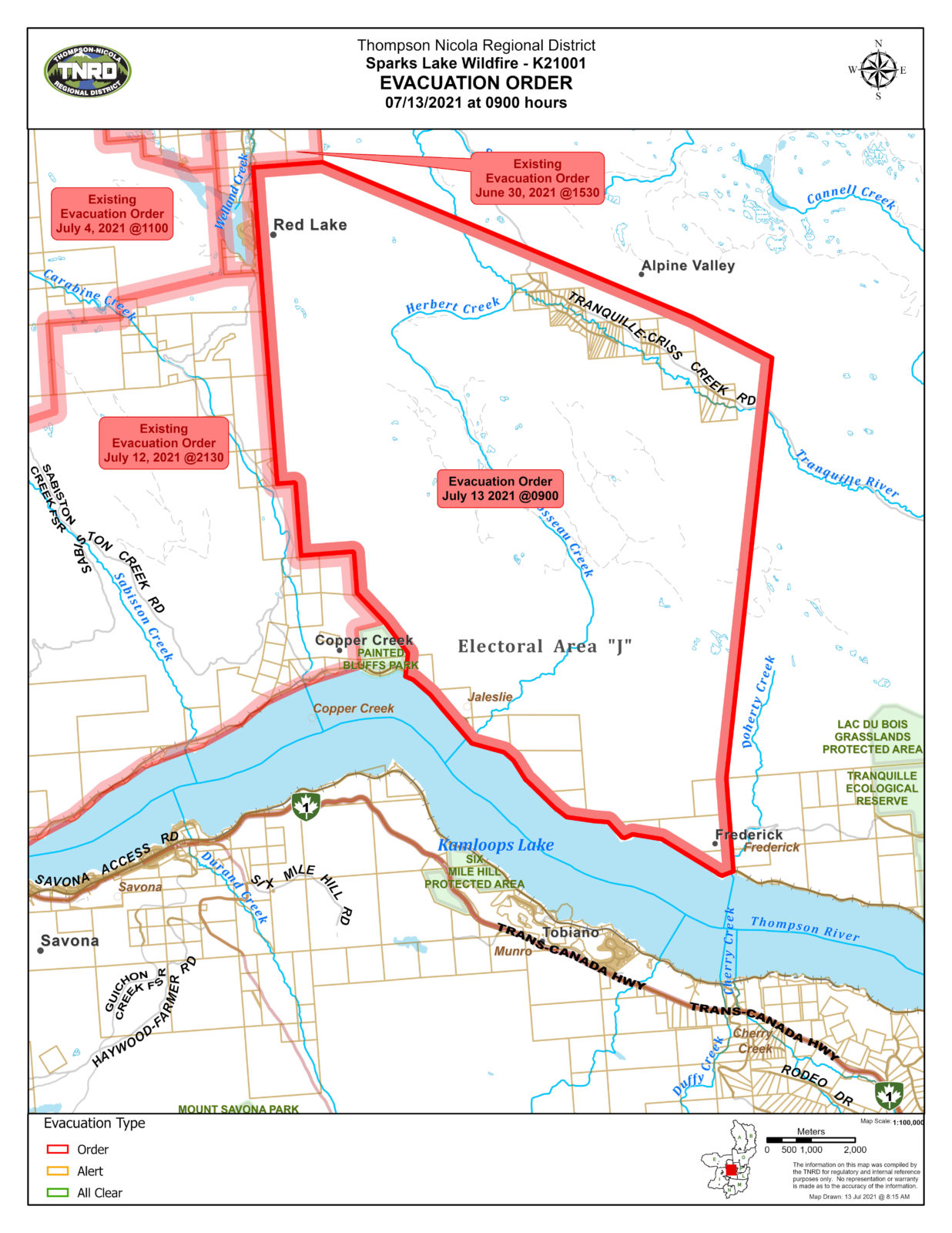 The Thompson-Nicola Regional District (TNRD) issued a new evacuation order Tuesday morning (July 13), affecting 110 properties in the Red Lake and Criss Creek areas, all the way to the north shore of Kamloops Lake.