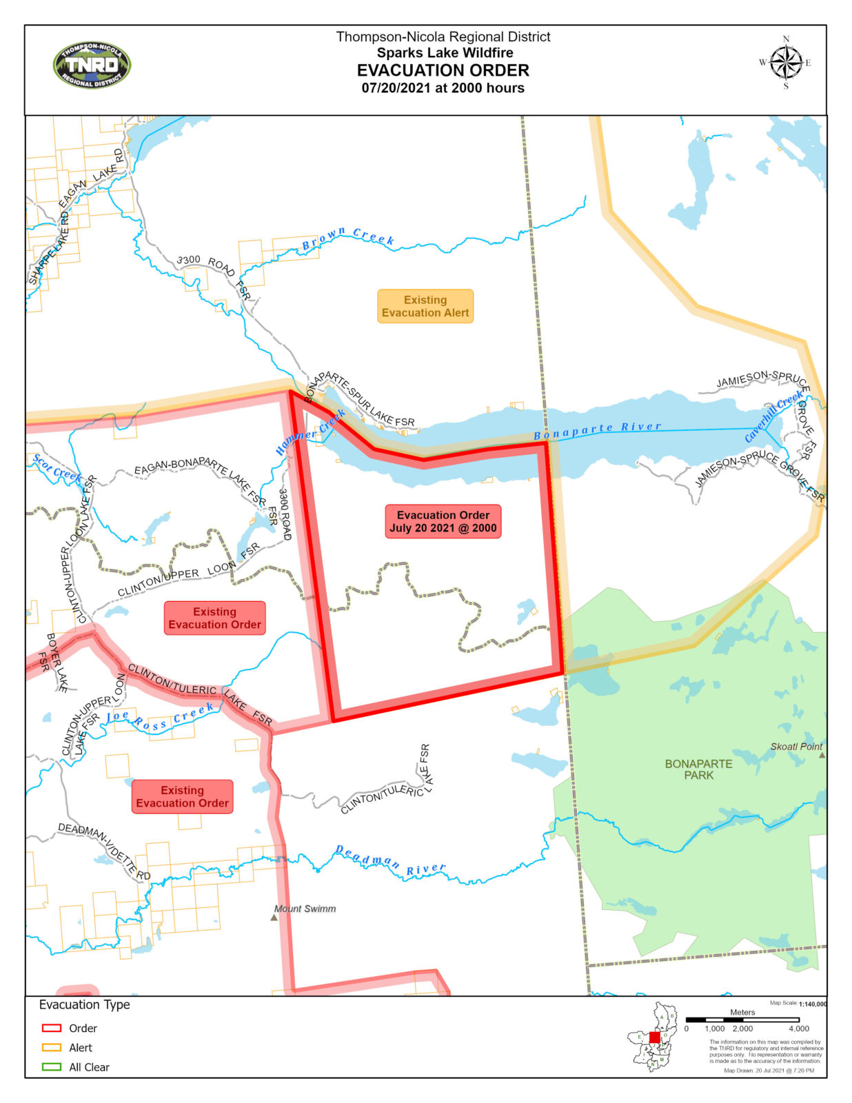 Tuesday evening (July 20), the Thompson-Nicola Regional District ordered the evacuation of seven more properties due to the Sparks Lake wildfire northwest of Kamloops.