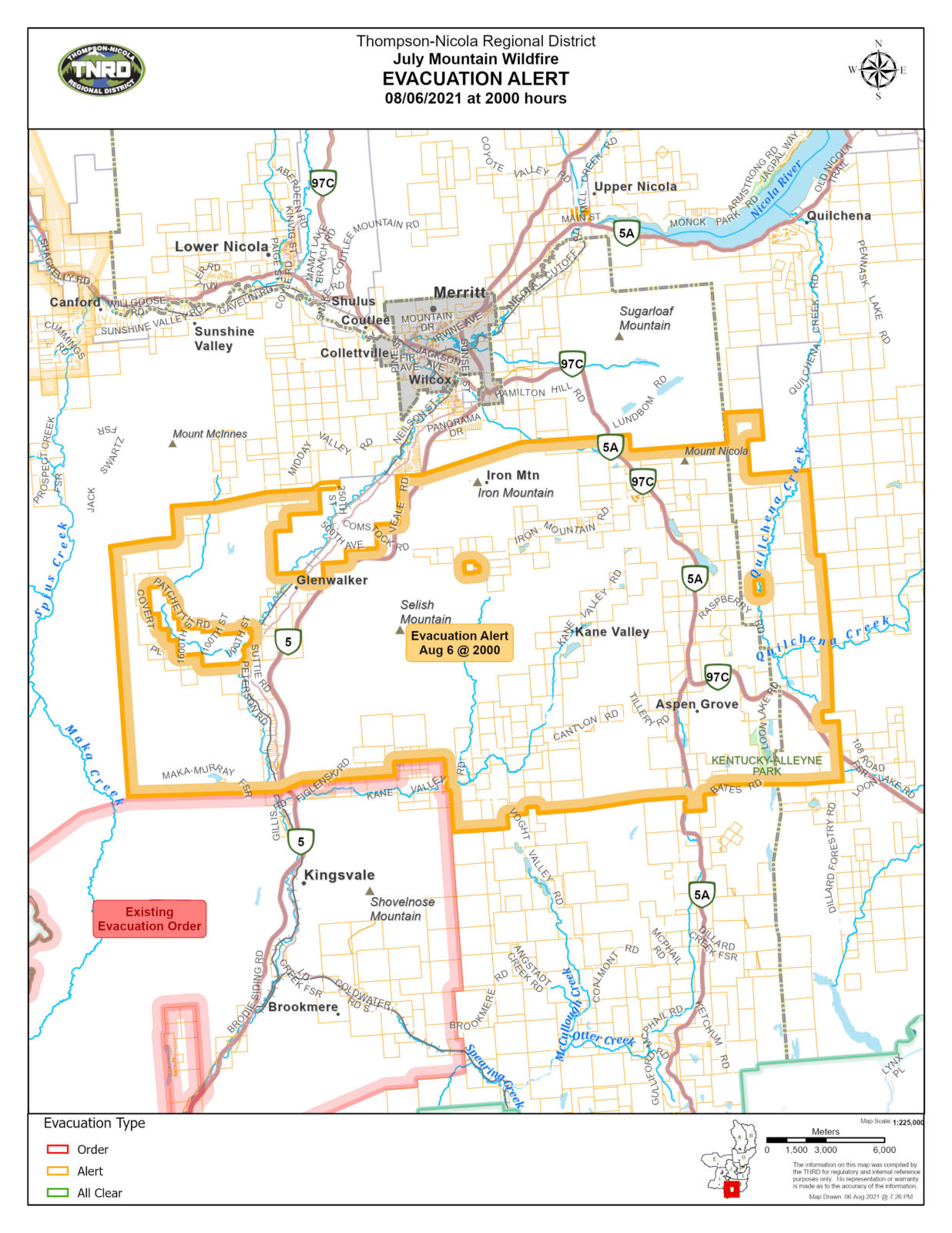 The Alert runs south from the Merritt area and shares a border with another area that was issued an Evacuation Order a short time earlier Friday (Aug. 6) evening.