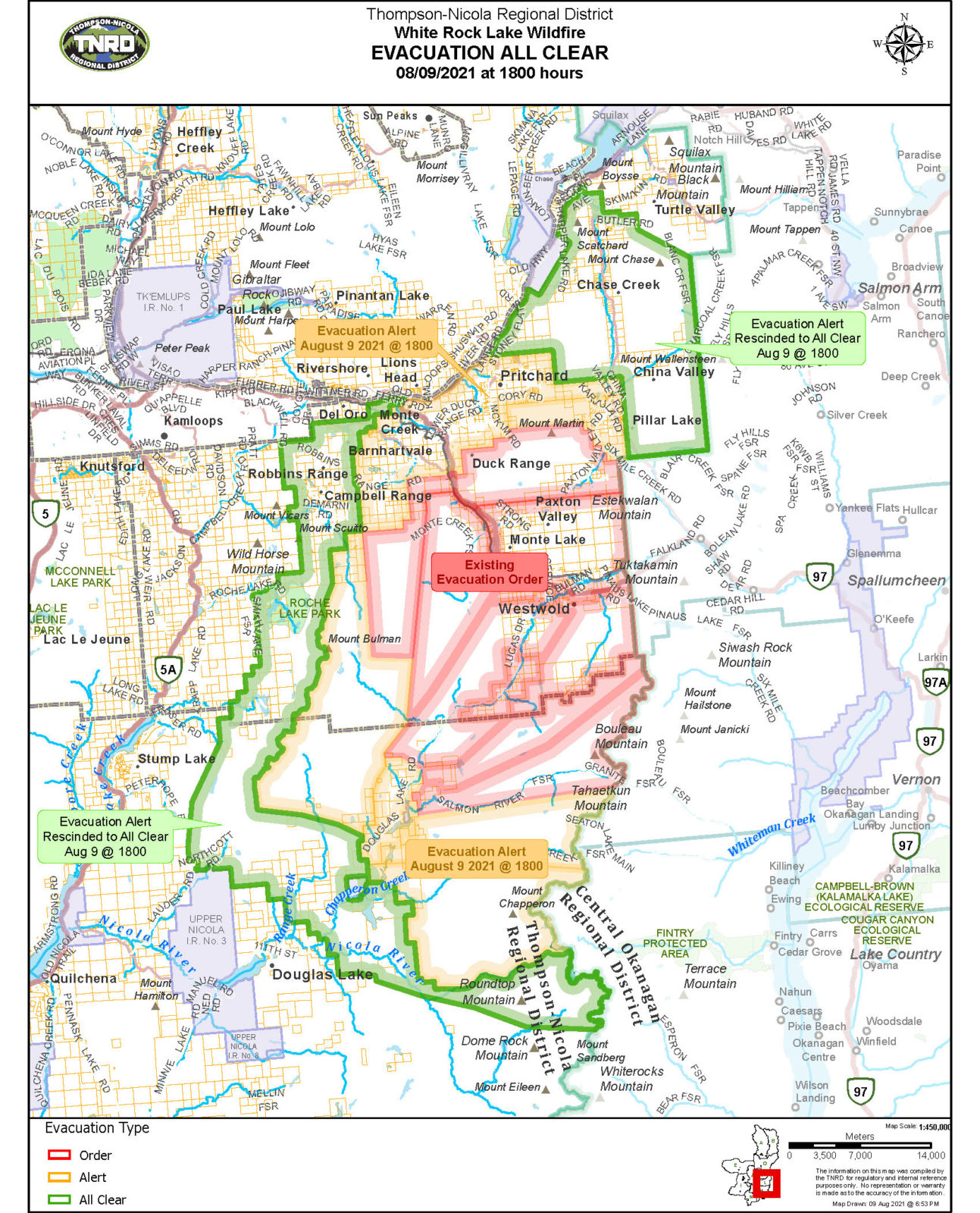 The northeastern flank of the fire has also received the all clear. That includes properties along the Chase-Falkland road. The Village of Chase also rescinded its Evacuation Alert earlier today (Aug. 9).