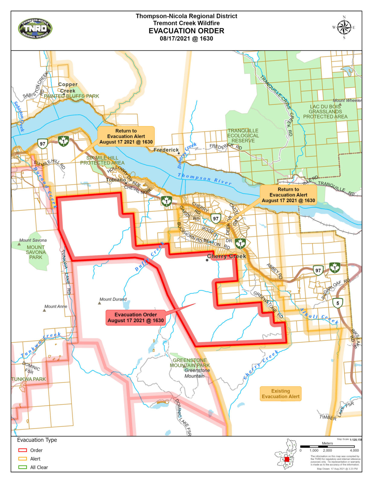 The Thompson-Nicola Regional District announced late Tuesday (Aug. 17) that an evacuation order for 166 properties in the community west of Kamloops has been downgraded to alert status.