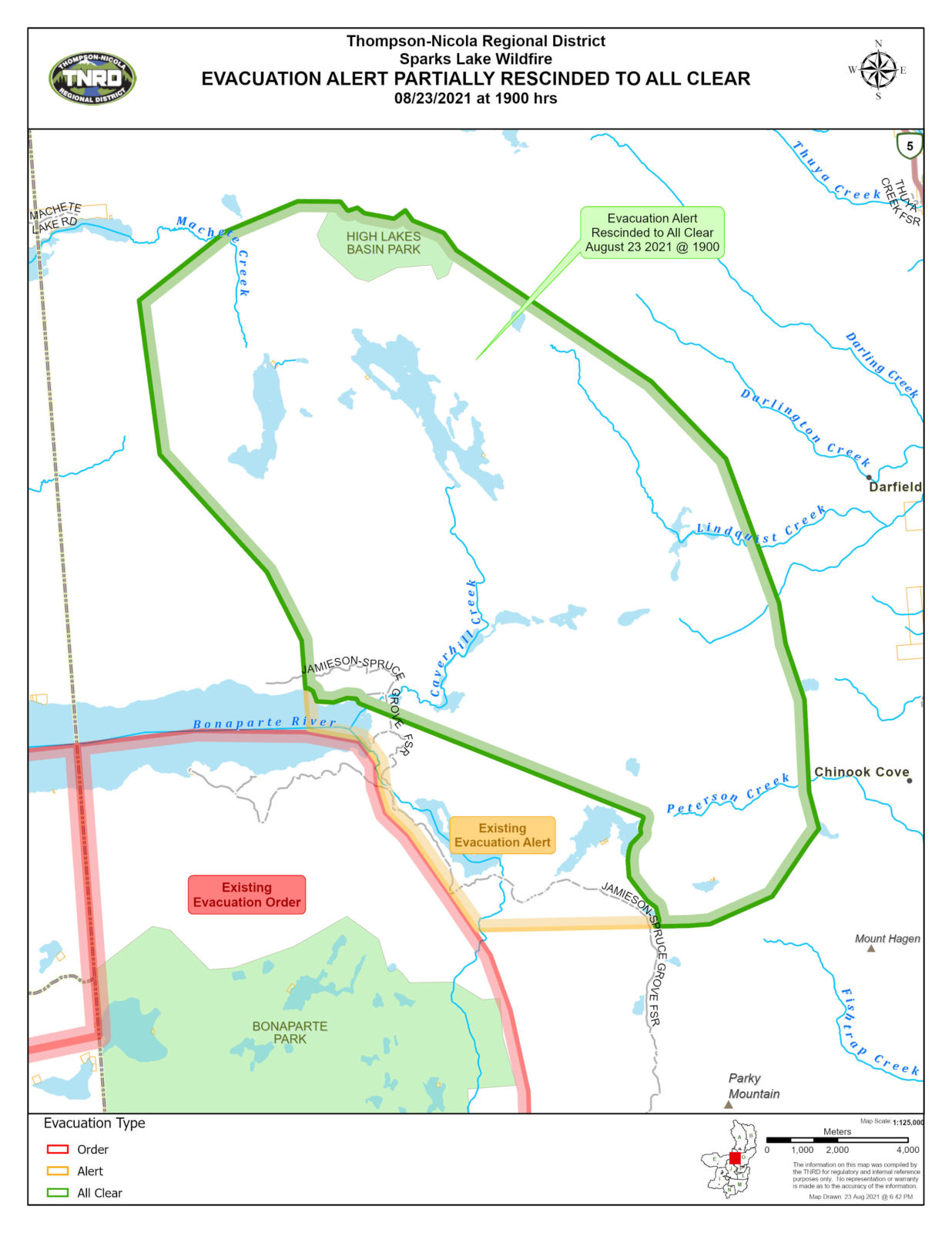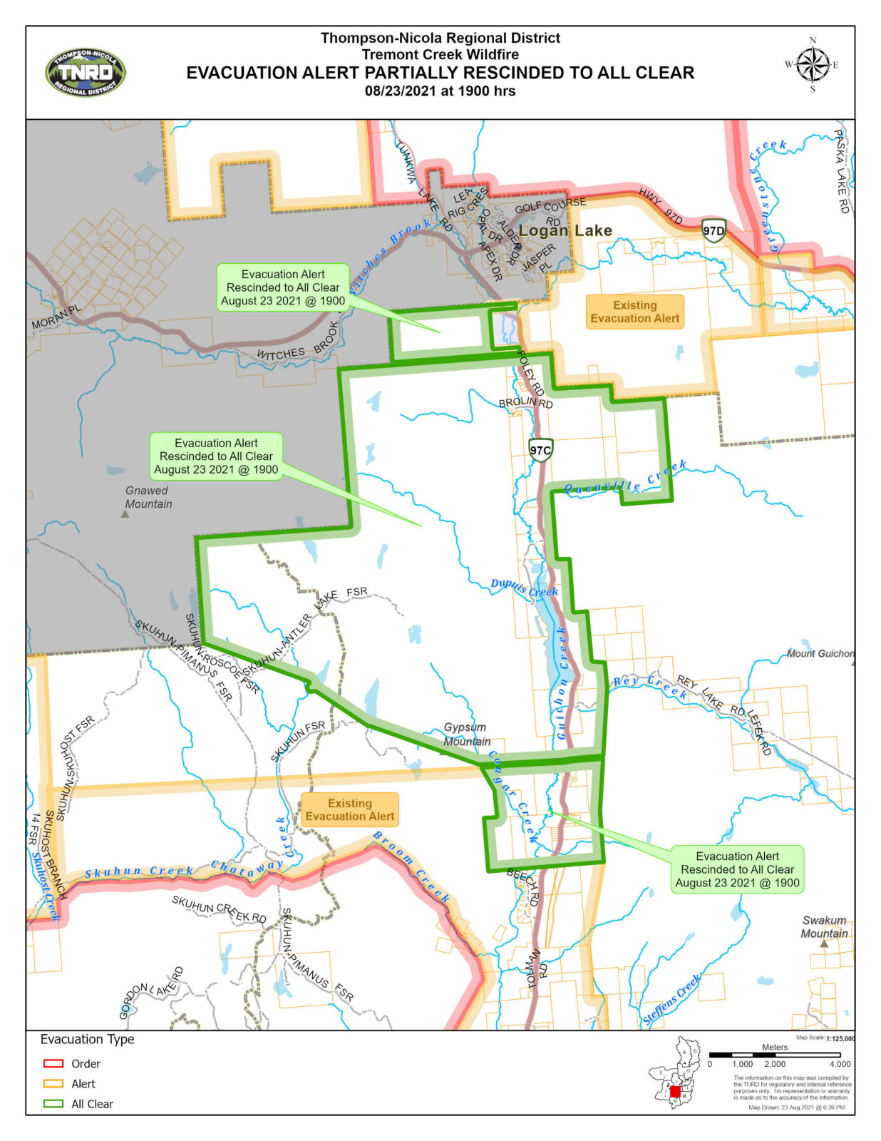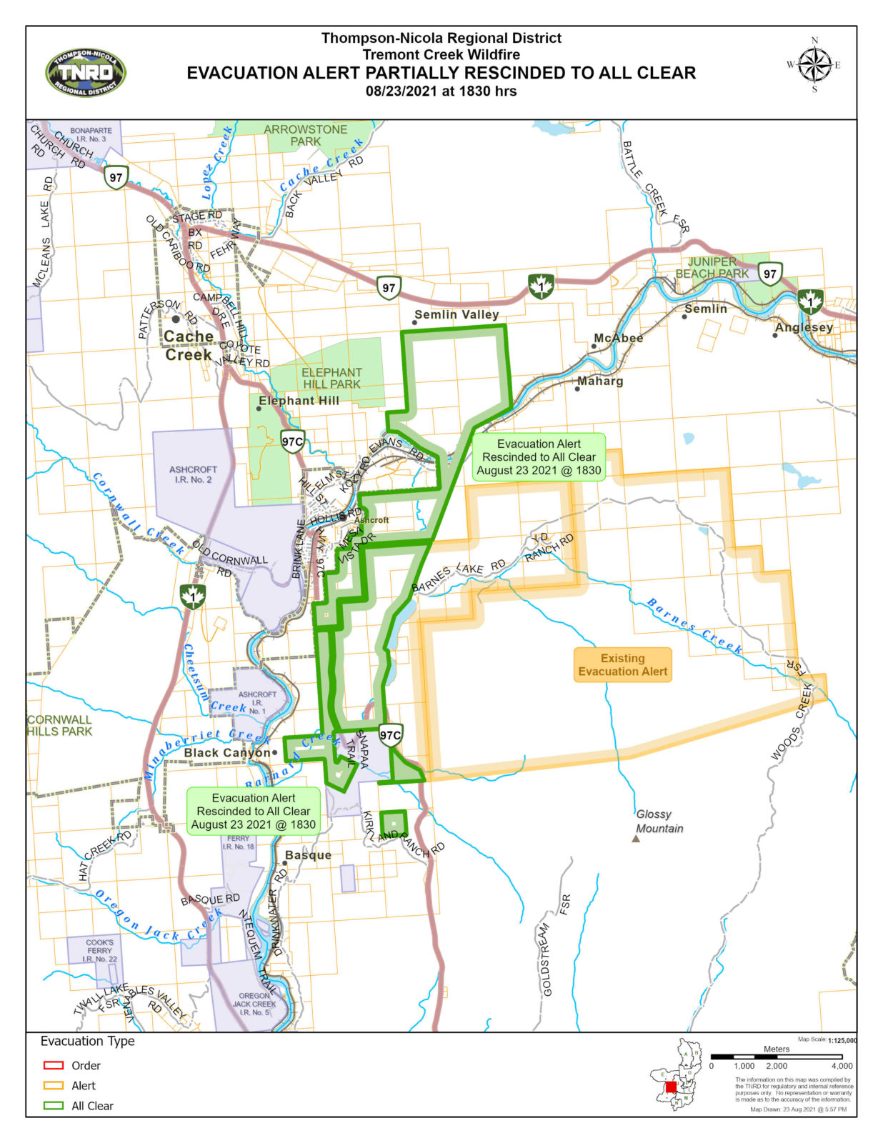 The TNRD rescinded one evacuation alert north of Highway 1 near Kamloops Lake, and partially rescinded two evacuation alerts: one south of Cache Creek and another south of Logan Lake. All three alerts were issued due to the threat of the Tremont Creek wildfire.