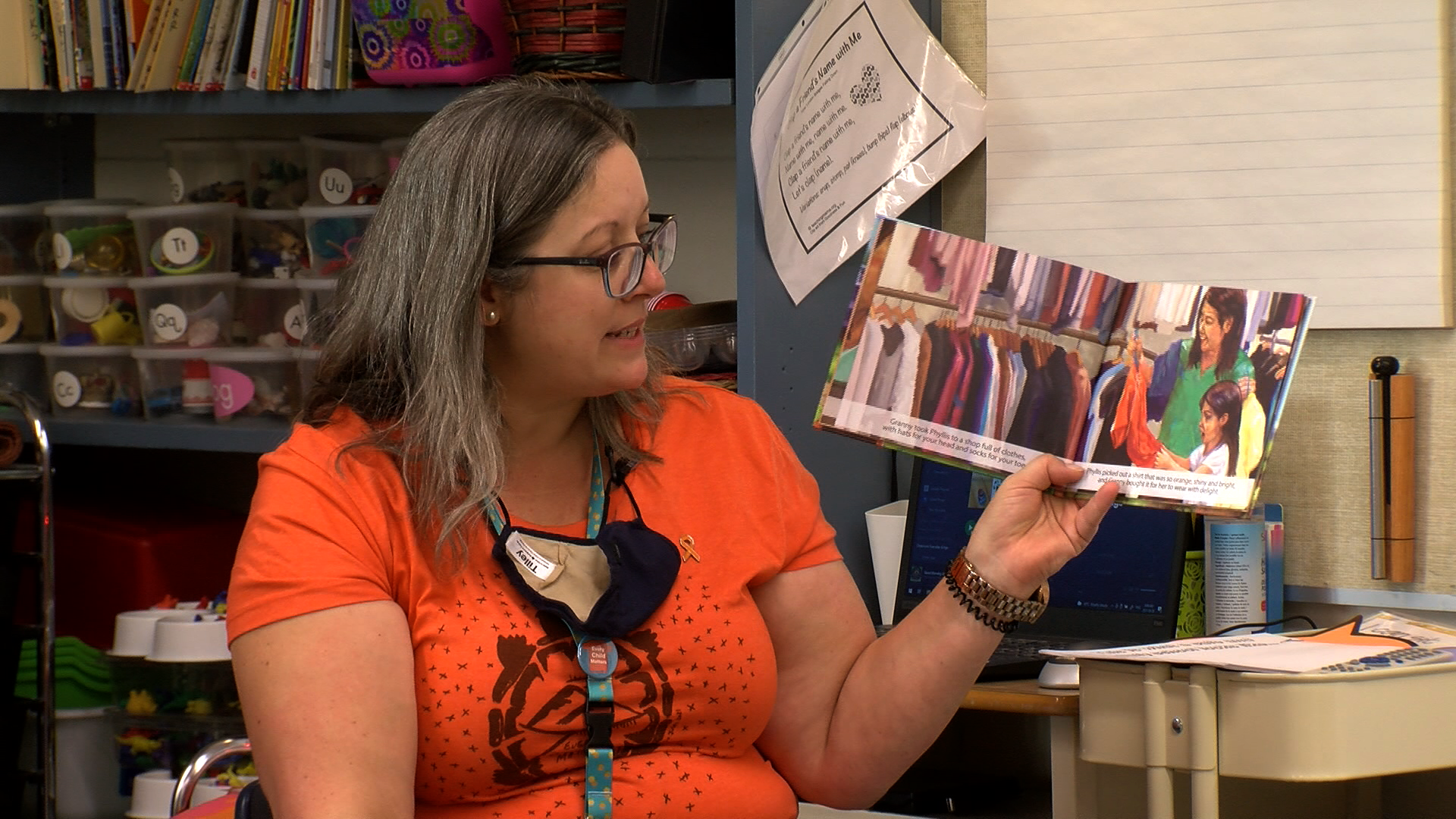 Mrs. Abate reads Phyllis’ Orange Shirt to her kindergarten students at AE Perry Elementary (Image Credit: CFJC Today)