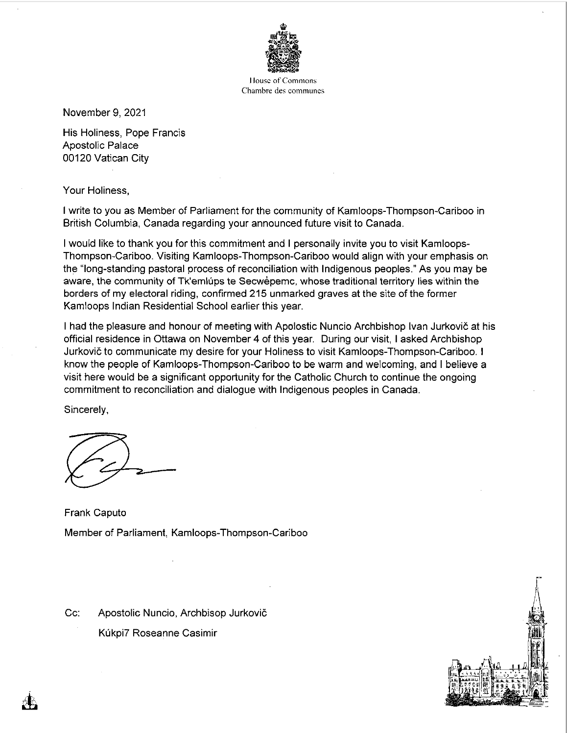 MP Caputo invites Pope Francis to visit Tk’emlúps te Secwépemc to advance reconciliation
