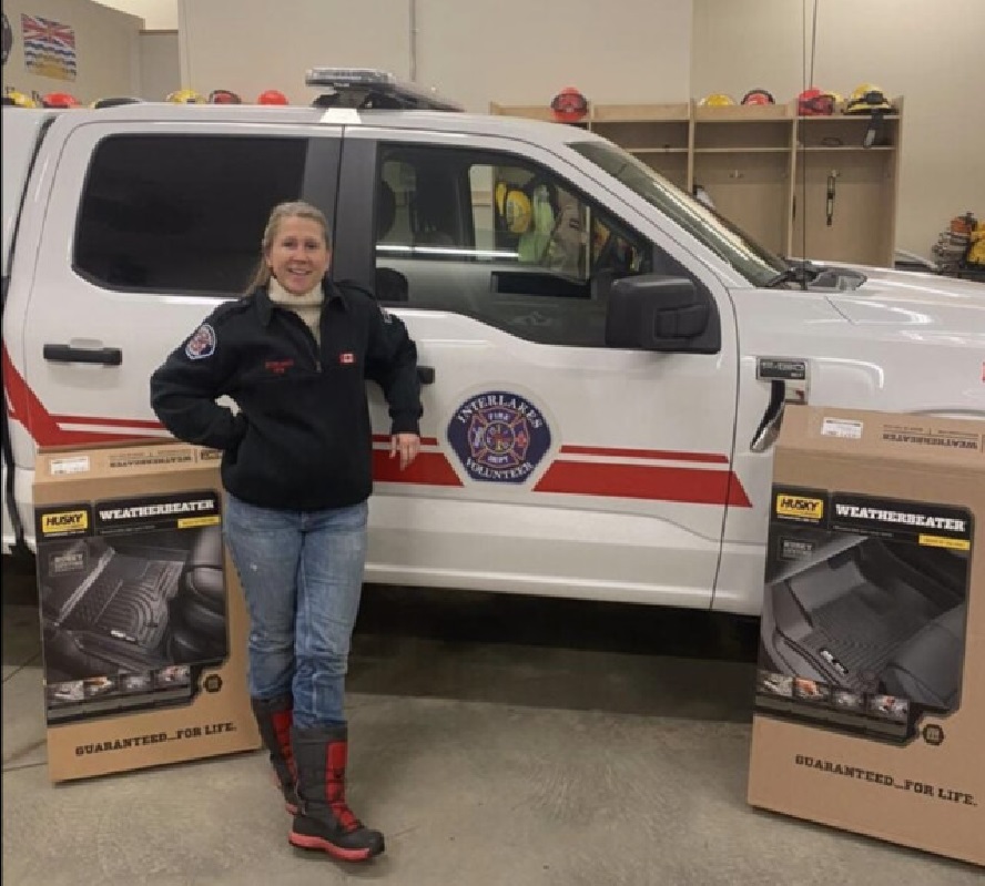 The stolen truck is a white Ford F150 with BC license plate RN1120. The truck has the Interlakes Fire crest on the front driver and passenger doors, as well as red striping on the sides and a white canopy.