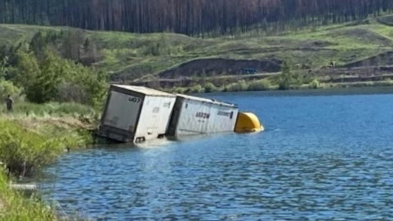 Cpl. Mike Halskov of B.C. Highway Patrol says there were two occupants in the transport truck when, at about 3:00 p.m., it careened off Highway 97 and into the lake.