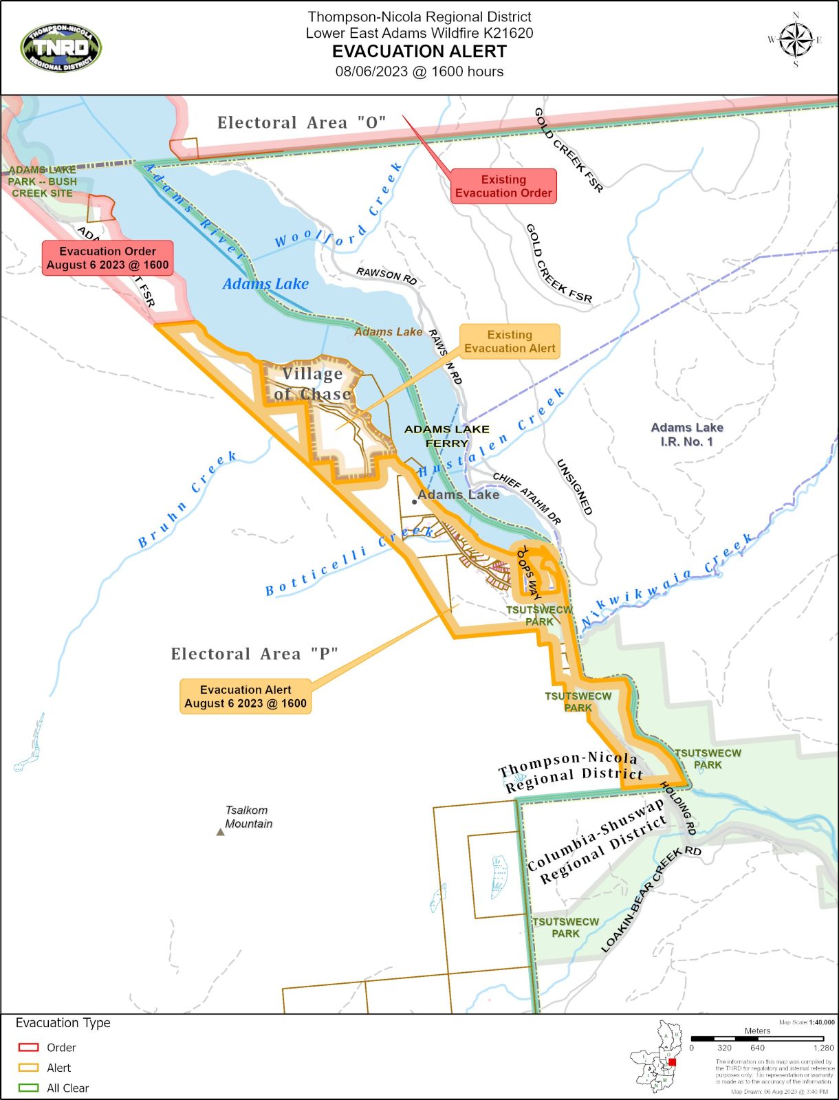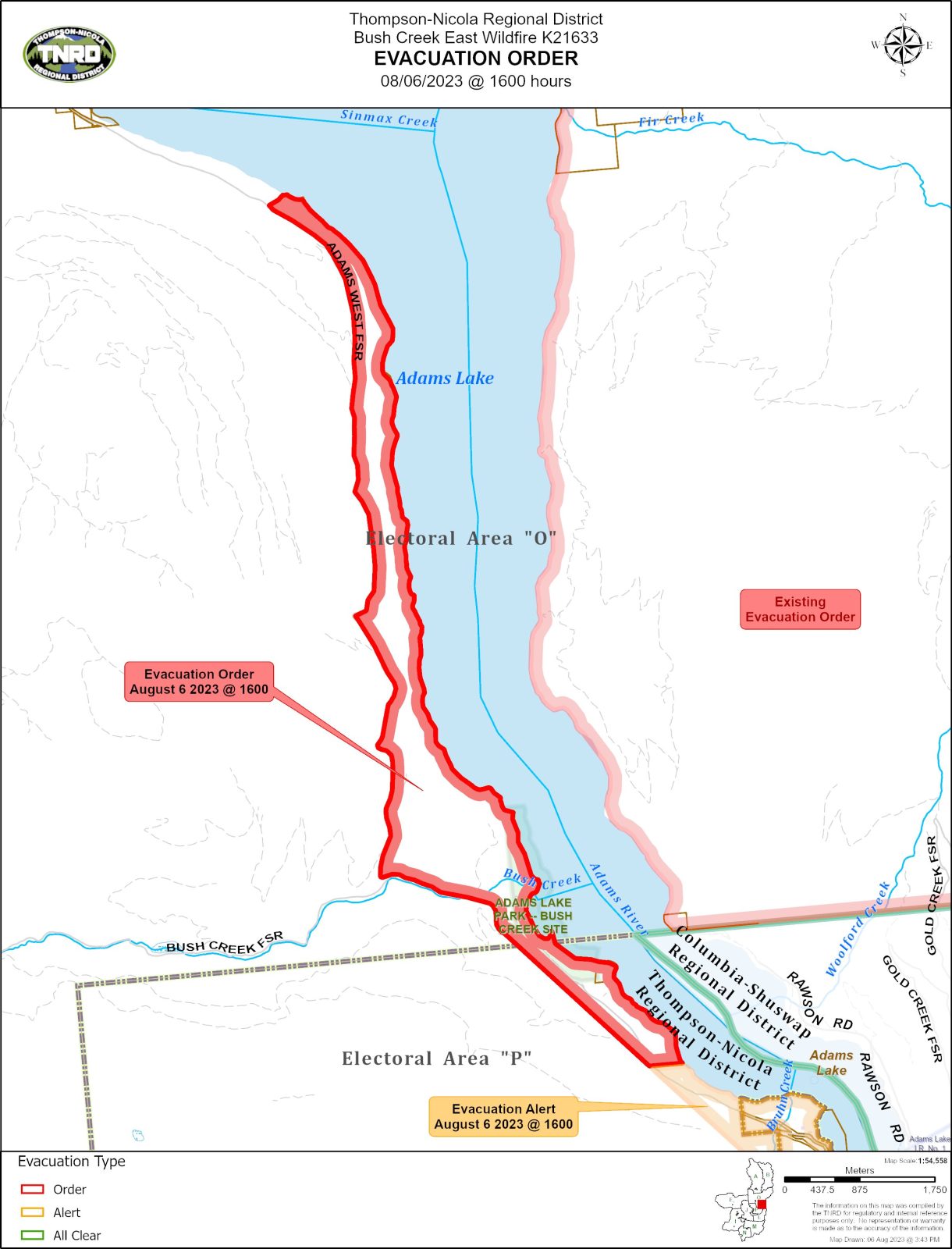 At 4 p.m. Sunday (Aug. 6), the TNRD issued evacuation orders for nearly 13 properties within the Lower North Thompson and Rivers and the Peaks electoral areas due to the nearby Bush Creek East wildfire.