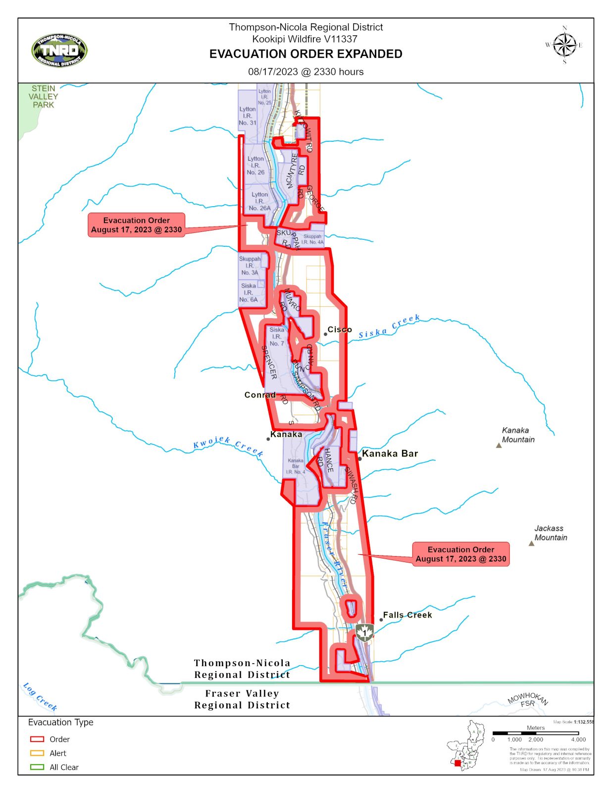 In a news release late Thursday (Aug. 17) evening, the Thompson Nicola Regional District (TNRD) issued an evacuation alert for 216 properties within the Village of Lytton due to the Kookipi Creek wildfire. The impacted properties are outlined in orange in the attached map.