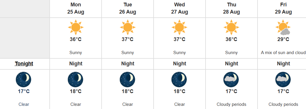 Overnight lows are expected to be around 17 C tonight as well as on Thursday and Friday, and 18 C Monday through Wednesday.