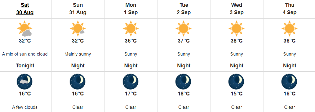 The weather agency is also calling for another spell of heat starting Labour Day Monday (Sept. 1). Daytime high temperatures are expected to be between 36 and 38 C Monday to Thursday, with overnight lows of 17 C and 18 C expected Monday and Tuesday.