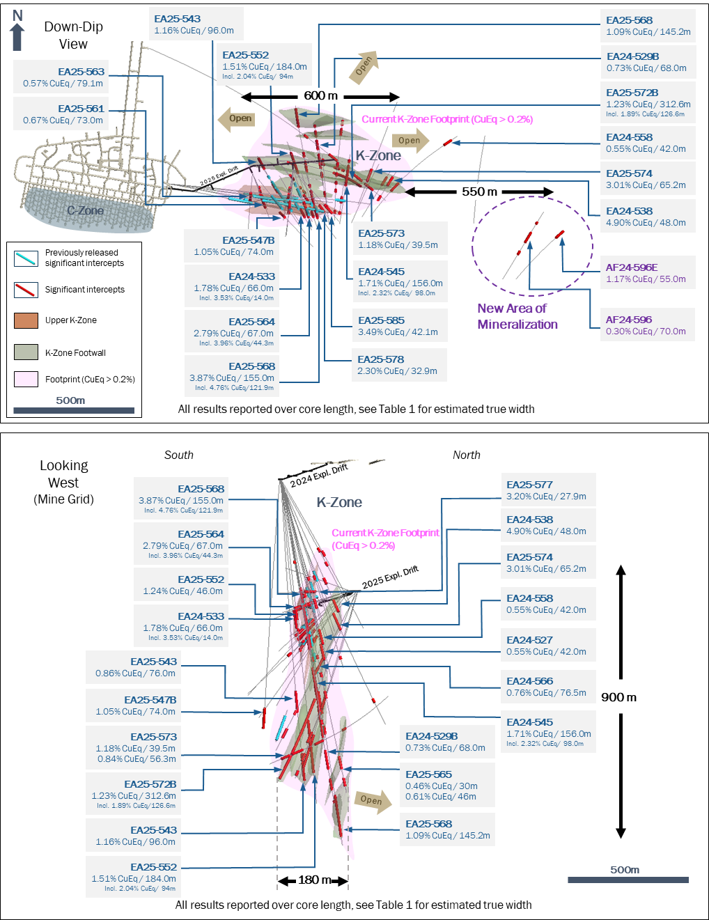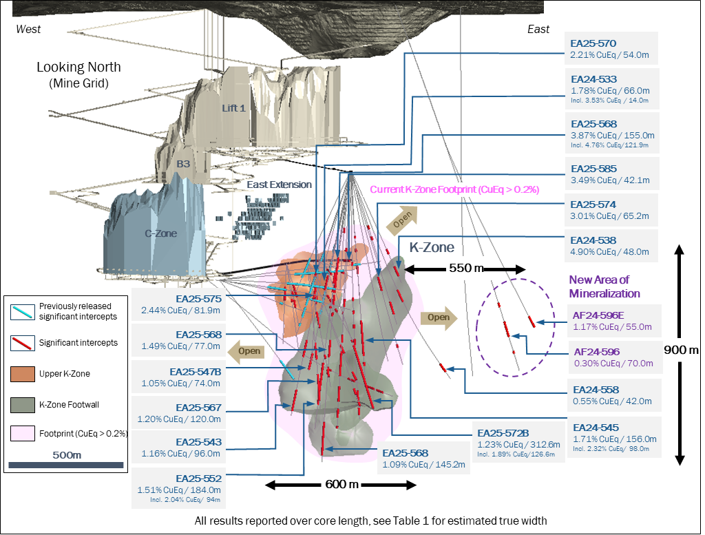 According to the company, the New Afton K-Zone mineralized system now reaches nearly 600 metres in strike length and 900 metres in vertical extent, while exploration drill holes from surface have intersected new mineralization 550 metres to the east of the current footprint, demonstrating the potential for further growth.