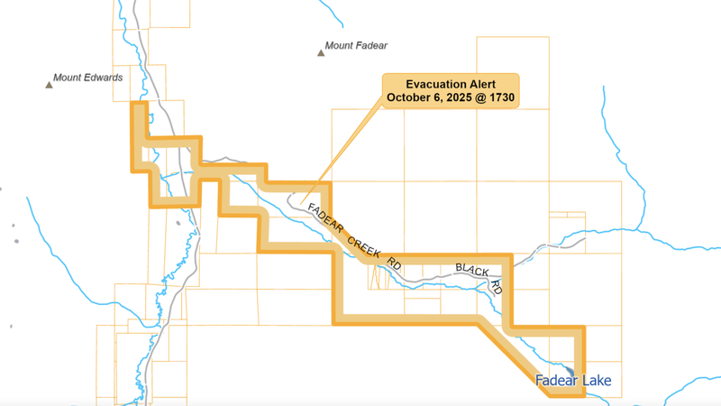 In an alert issued Monday evening (Oct. 6), the TNRD says it has been informed by the provincial Ministry of Water, Lands and Resource Stewardship an ‘unauthorized dam structure’ on Fadear Lake is showing signs of weakness. The ministry says the dam “is at risk of imminent failure, which could result in an uncontrolled release of water from the lake into Fadear Creek.”