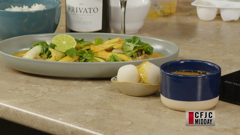 CFJC Midday – Panang Curry paired with Pinot Noir and a Crème Brûlée dessert! Chef Romeo showcases delicious dishes using local ingredients and products