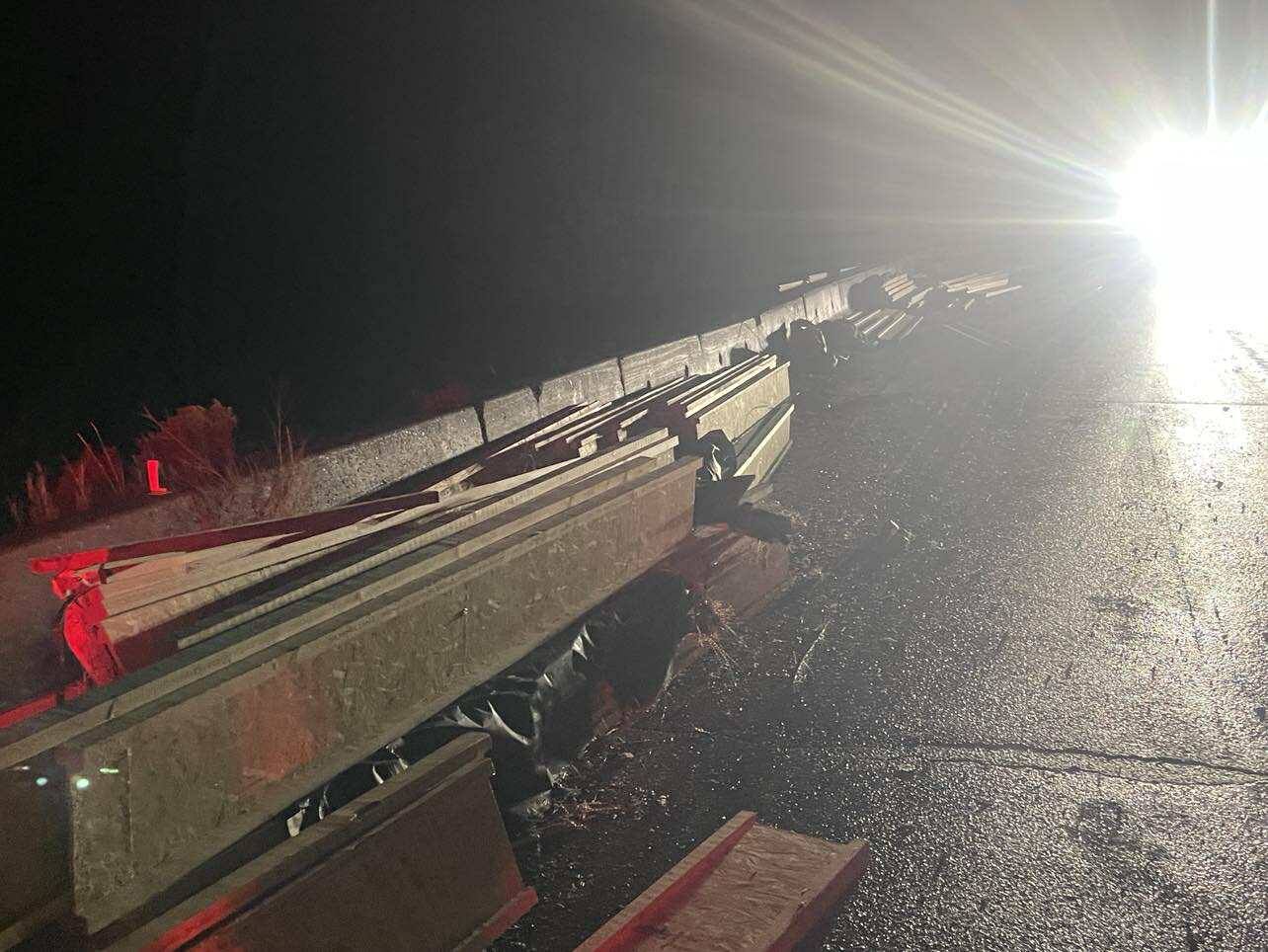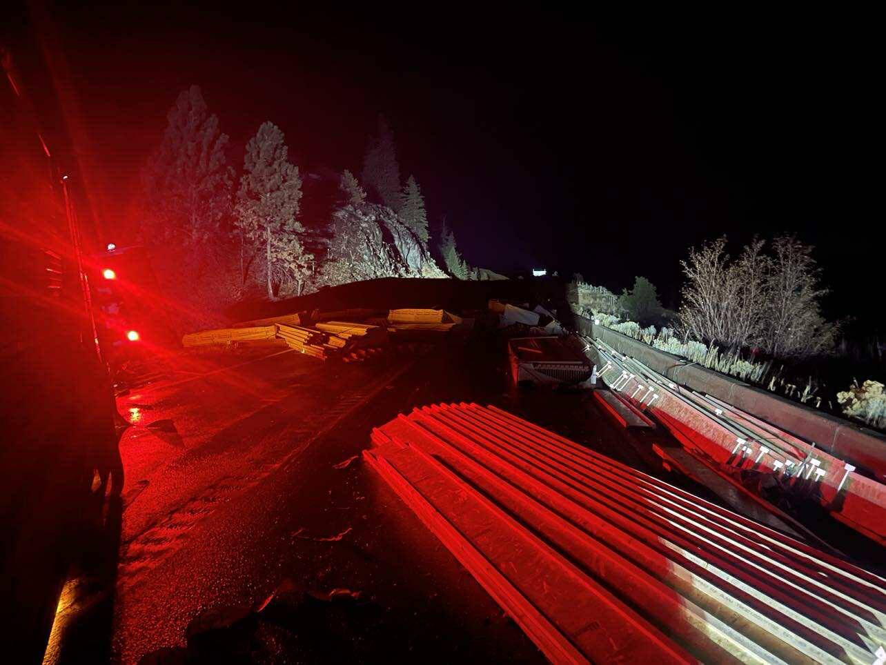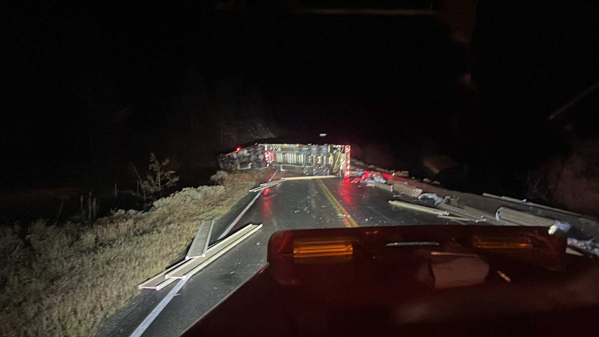 Photos posted to social media show a semi-truck rolled over on the stretch of Highway 5A with its load spread along the roadway.