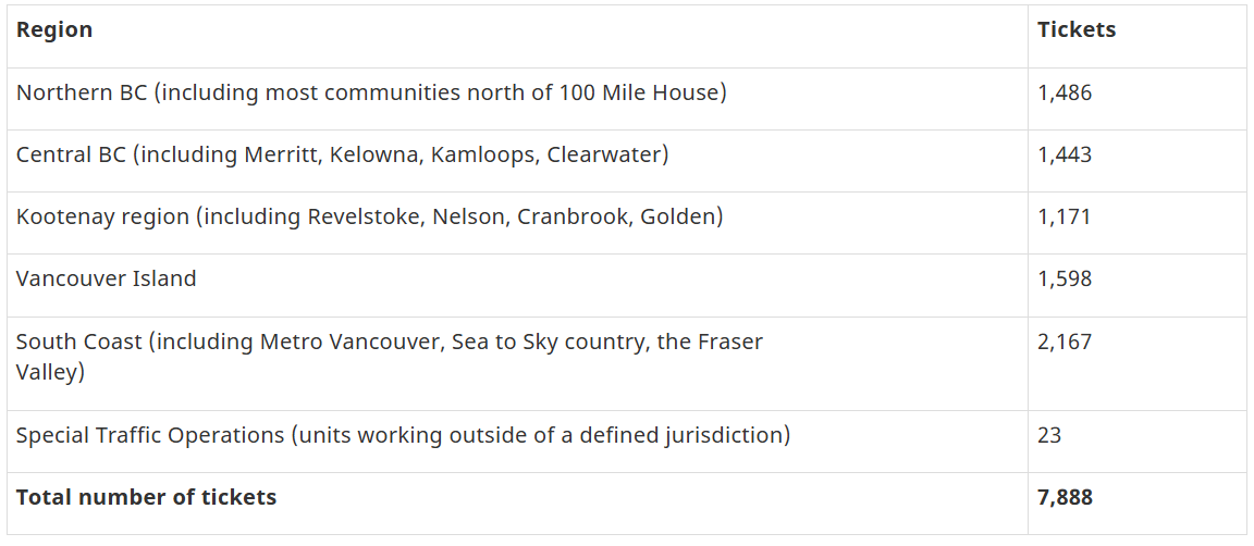 Police say 1,442 tickets were issued in central B.C., which includes the areas around Merritt, Kelowna, Kamloops and Clearwater. Another 1,486 were issued in northern B.C, which includes most communities north of 100 Mile House.