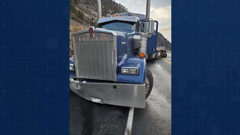 According to BC Highway Patrol (BCHP), a blue northbound Kenworth towing two empty flat-deck trailers collided with a green southbound Volvo towing two enclosed trailers.