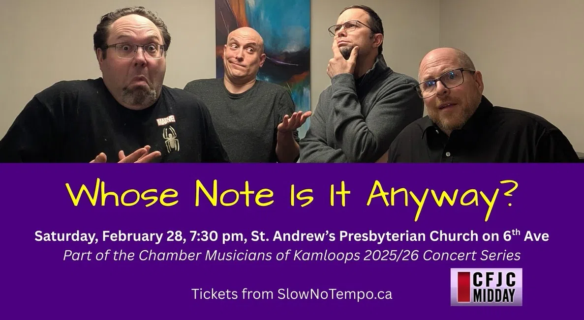 CFJC Midday – A cappella, humour and an variety of music spanning a many genres! Catch Slo No Tempo Quartet in Who’s Note is it Anyway?