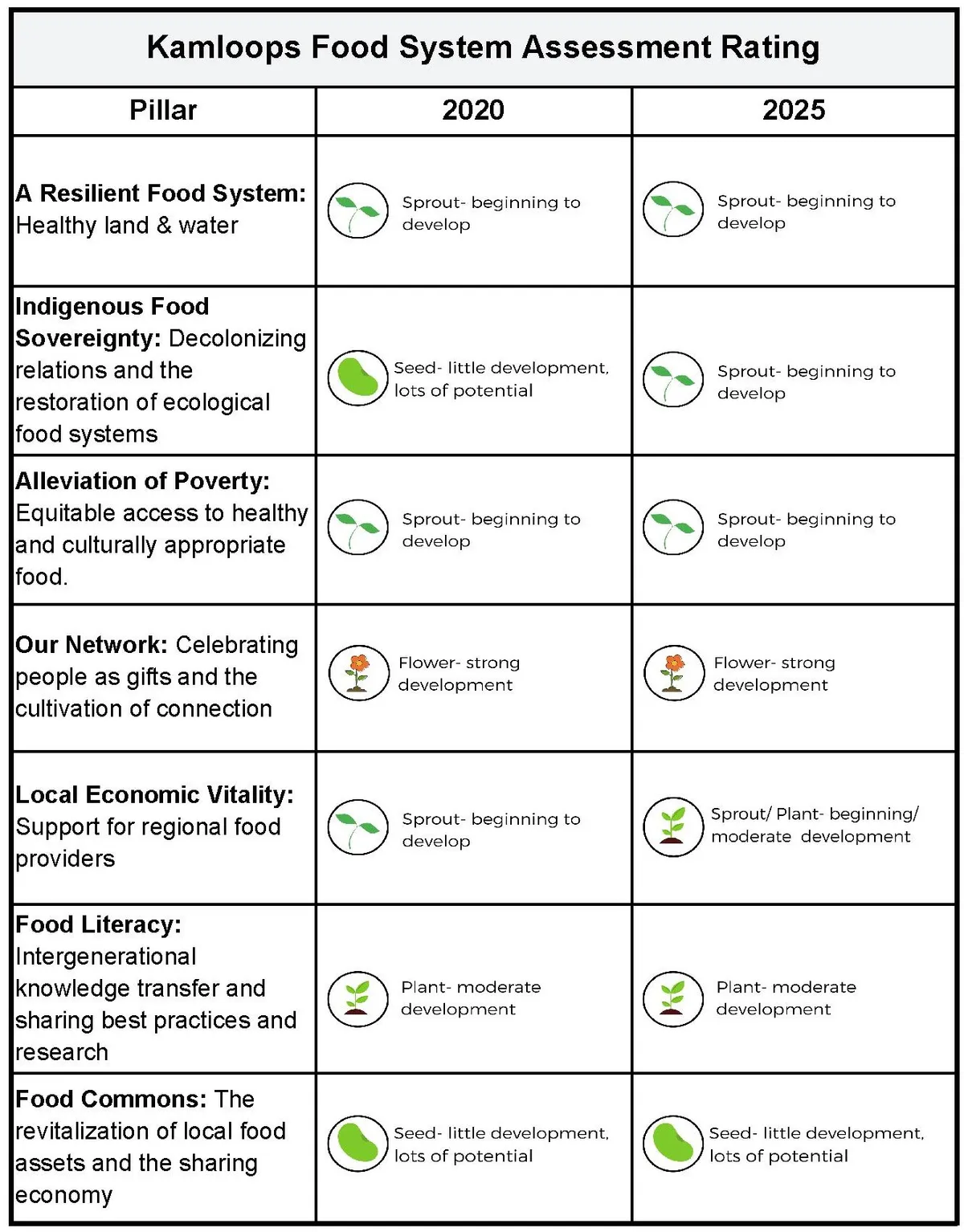 Kamloops’ latest Food System Assessment shows a community and sector that is not only adapting to change but steadily building a more connected and resilient local food landscape. Releasing later this year, the 2025 report highlights strong progress across several areas of the food system and emphasizes the importance of innovation, collaboration and renewed community energy through the lens of a changing regional landscape. Picking up where the last report left off in 2020, the current assessment utilizes the same metrics from the previous report, the assessment evaluates the region’s food system using the Seven Pillars of Food Sovereignty. Adopted in 2007 by Food Secure Canada and adapted for the Kamloops context, the Seven Pillars identify what is required to develop a food system that is sustainable, just, and equitable. The Pillars include: A Resilient Food System, Indigenous Food Sovereignty, Alleviation of Poverty, Our Network, Local Economic Vitality, Food Literacy and Food Commons. The pillars are then graded rubric based on a progress level of Seed, Sprout, Plant, Flower and Fruit. See the table near the end of the article for the assessment ratings of 2020 and 2025.