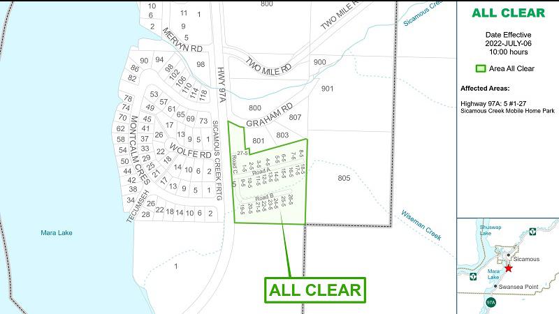 SICAMOUS, B.C. - The Sicamous Creek Mobile Home Park has once again been given all clear status. In an alert posted by the Columbia Shuswap Regional District (CSRD) Wednesday (July 6) morning, the Dis...