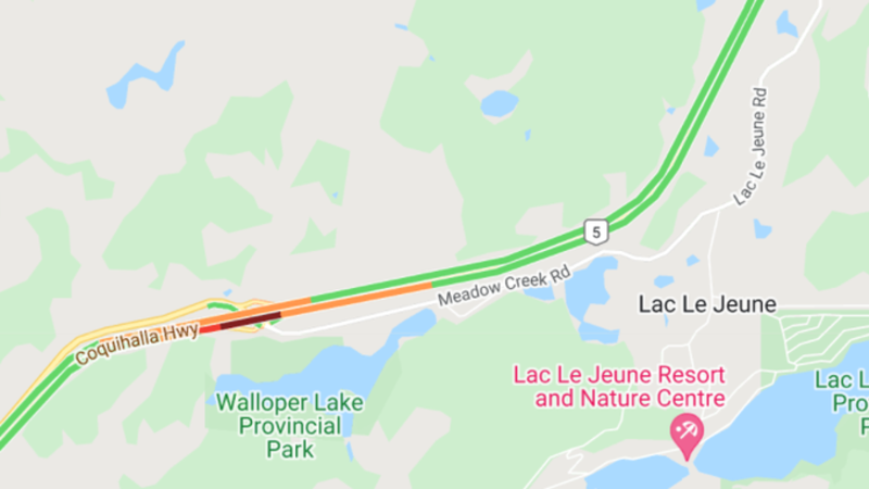 Highway 5 left northbound lane closed at Meadow Creek Road in Lac le Jeune
