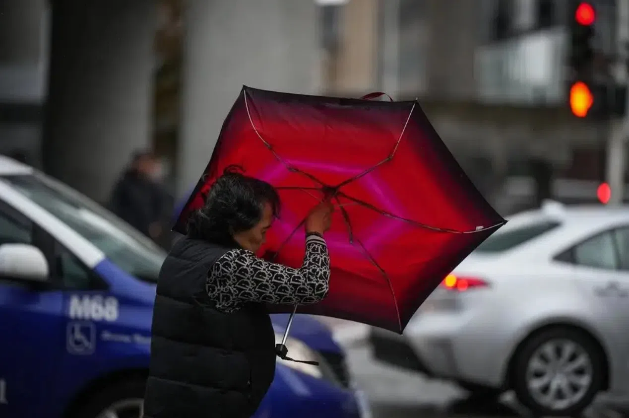 Pattison Media Jan 12, 2026 A woman struggles with an umbrella in the wind in the file photo. (Image Credit: Darryl Dyck/The Canadian Press)