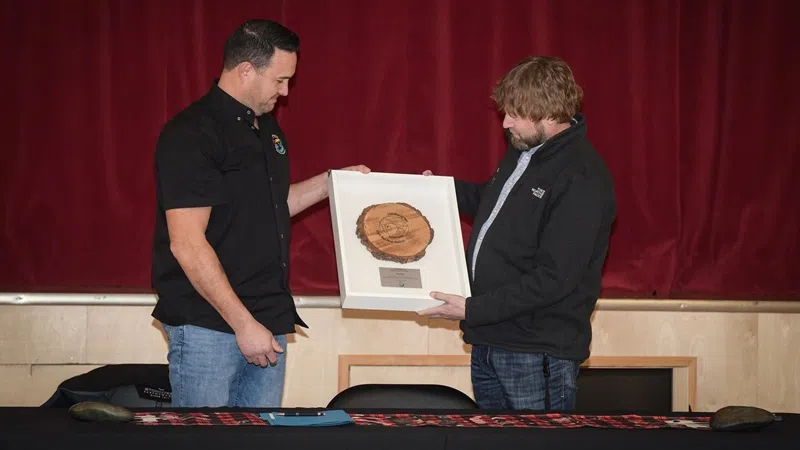 Pattison Media Jan 06, 2026 HBFN Kúkpi7 Jamie Fletcher (left) and Kris Geekie, Westcoast Energy Inc. director of community and Indigenous engagement (right) (Image Credit: HBFN/Contributed)