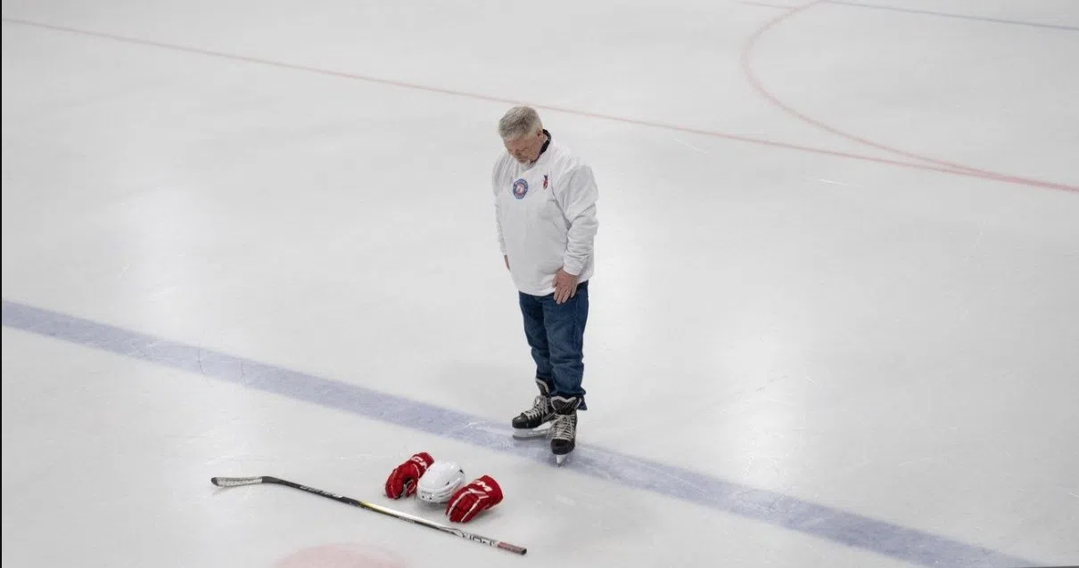 Pattison Media Feb 09, 2026 Chris Wright, father of JJ Wright, looks at his son's stick, helmet and gloves before the start of the Stavely Mustang hockey game in Stavely, Alta., Sunday, Feb. 8, 2026 (Image Credit: Todd Korol/The Canadian Press)
