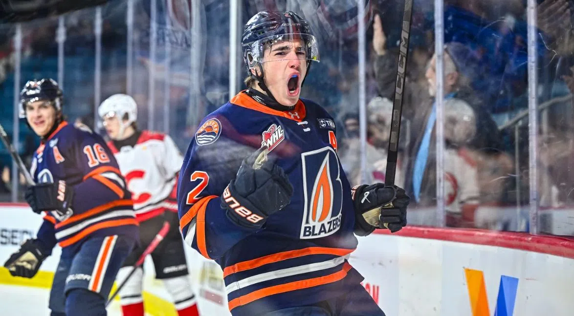 Pattison Media Feb 03, 2026 JP Hurlbert celebrates against the Prince George Cougars on Jan. 16, 2026. (Image Credit: Brian Johnson/Kamloops Blazers)