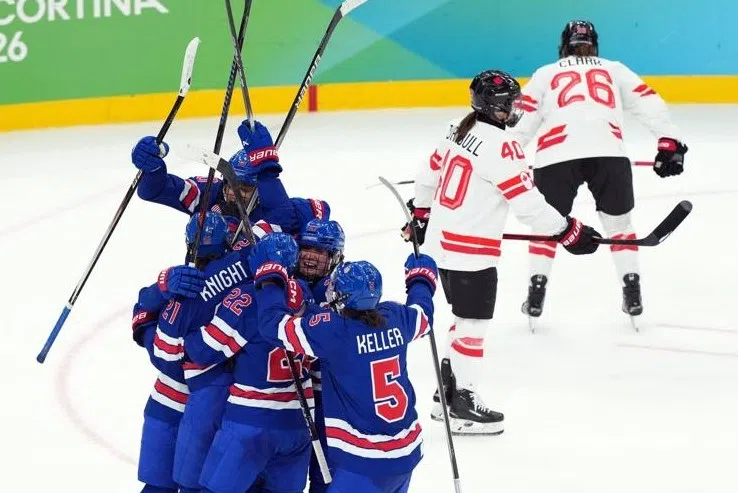 The Canadian Press Feb 19, 2026 Team USA celebrates a goal against Canada in the women's gold medal hockey game at the 2026 Winter Olympics. (Image Credit: Nathan Denette/The Canadian Press)