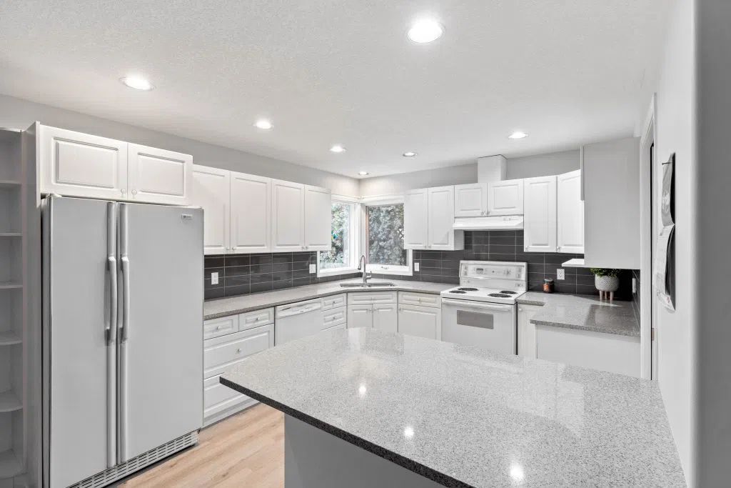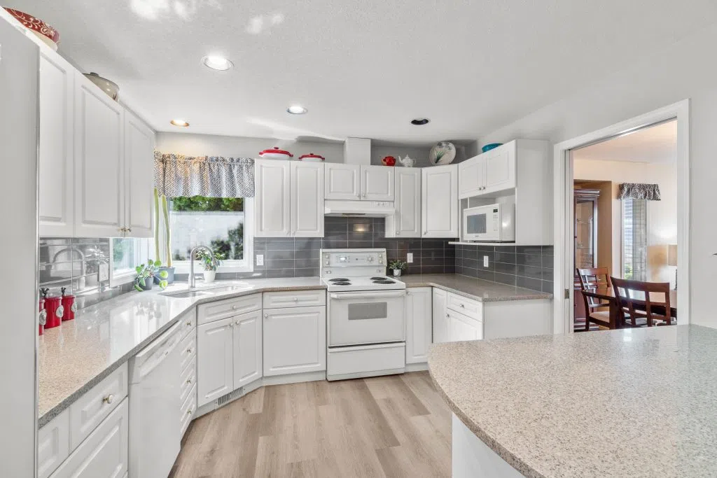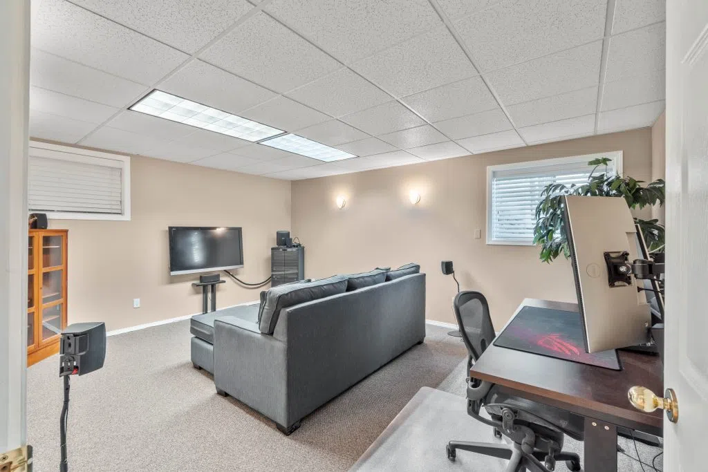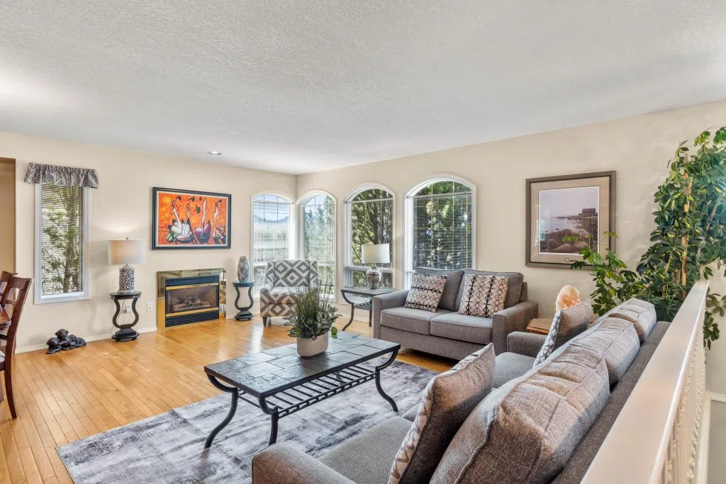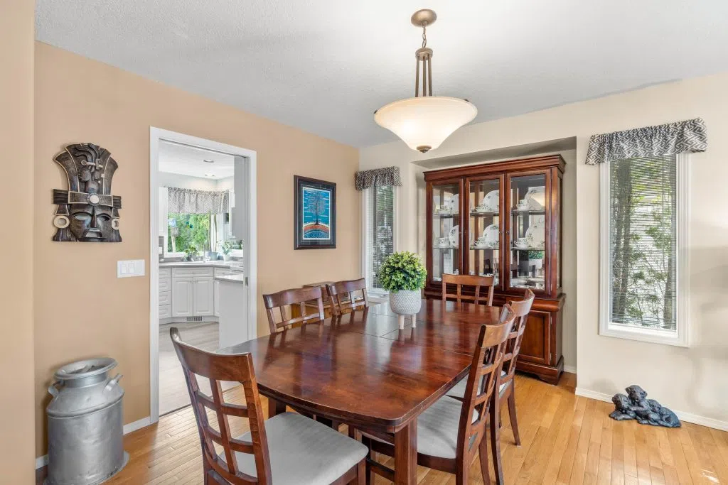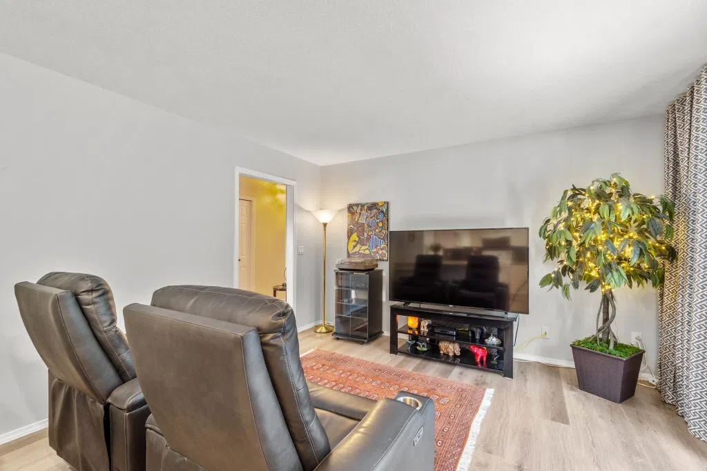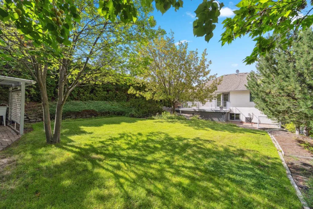 Private Family Oasis Backing Onto Greenspace. Welcome to a rare find—a beautifully maintained family home that offers the perfect blend of indoor comfort and outdoor serenity. Nestled in a peaceful neighborhood, this 4-bedroom, 3-bath home backs directly onto city green space, creating a private and park-like setting right in your backyard. Enjoy two levels of outdoor living with a spacious upper deck with pre-wired speaker system and a lower patio finished with brick pavers—perfect for entertaining or relaxing. Mature landscaping, a seasonal water feature with lighting and goldfish potential, and fruit trees (plum and apricot) add natural charm. The backyard also includes UG sprinklers, a covered gardening station with sink, solar-lit garden shed & outdoor shower -truly an outdoor enthusiast’s dream. Inside, the home continues to impress. The kitchen features quartz counters .French doors off the family room to the deck. Elegant arch windows, hardwood floors throughout the living room & natural gas fireplaces on both levels. A theatre room down with soundproofing & specialty lighting. The home also has a hobby/storage room, hands-free laundry lighting, barrier-free bathroom shower access downstairs. Primary has an ensuite with Jacuzzi tub and walk-in closet. Extras include: Double garage + RV parking, C/Air, C/Vacuum & air exchanger. High-E furnace & HW (2018) Wired for fiber internet (Telus). Central to Summit Elementary & transit. this home is move-in ready.