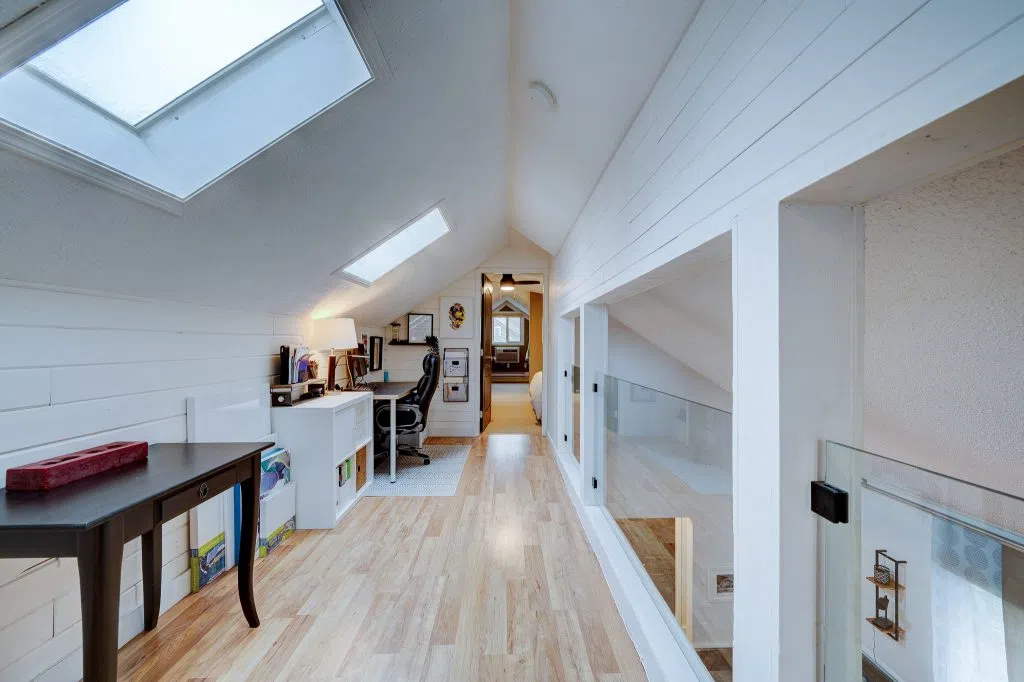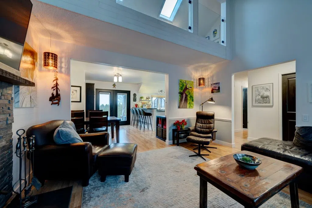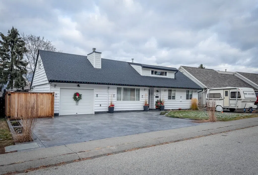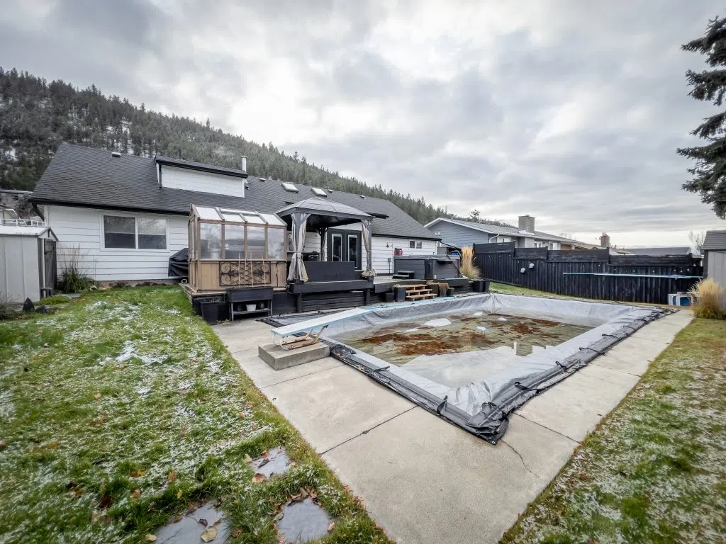 Welcome to this spacious 5-bedroom entry-level home in a prime location near schools, transit, and the Kamloops Bike Ranch. The upper level features a loft-style layout with vaulted ceilings, peak-roof windows that flood the space with natural light, a large den/office area, and a primary suite with a 3-piece ensuite boasting heated floors and a tiled shower with heated bench. The main floor offers a bright open-concept kitchen, dining, and living area with a cozy wood-burning fireplace. The kitchen boasts a gas range, and a large peninsula with bar seating and access to a generous laundry room with storage that leads to the side yard. On the main floor you will find 3 more bedrooms and a 4 pce bathroom with heated floors. Off the kitchen, step onto the outdoor deck overlooking the private backyard oasis complete with an inground saltwater pool, gazebo, grassed area, storage shed and landscaped gardens. Additional highlights include a stamped concrete driveway with RV parking, repoured garage flooring, natural gas BBQ hookup, underground sprinklers, irrigated garden beds, a crawl space and new side fencing—all just a short walk to the elementary school, dog park, and kids playground. All meas approx.