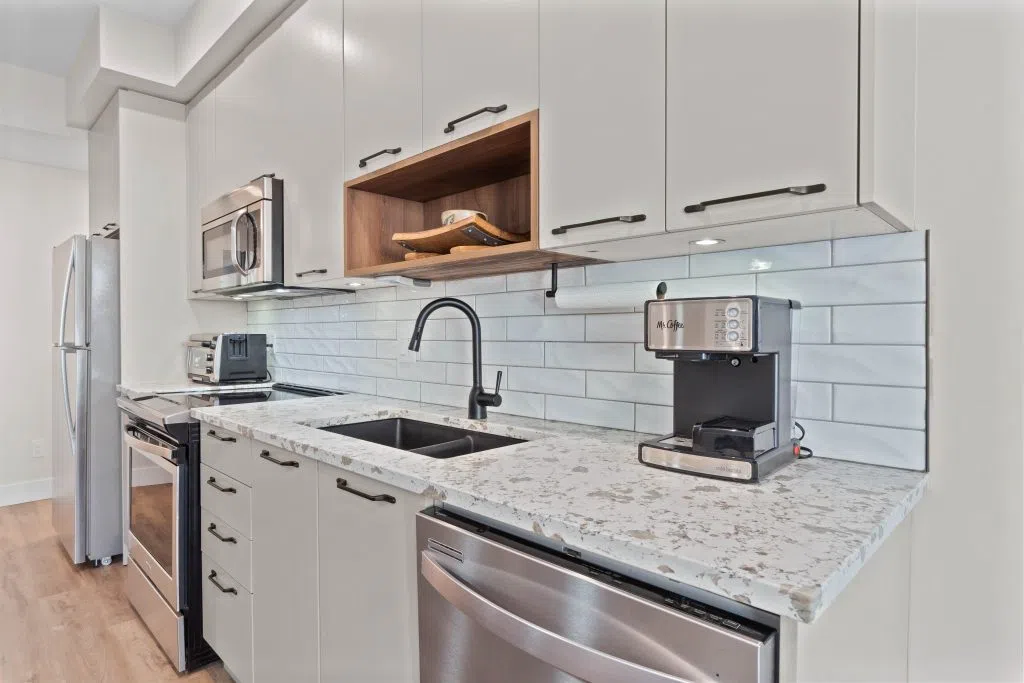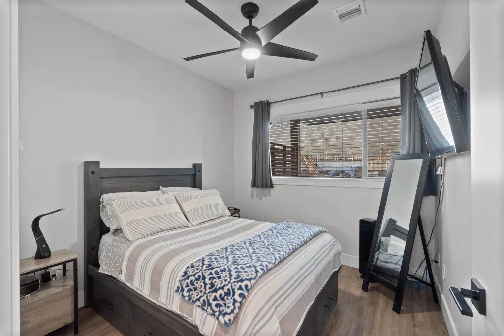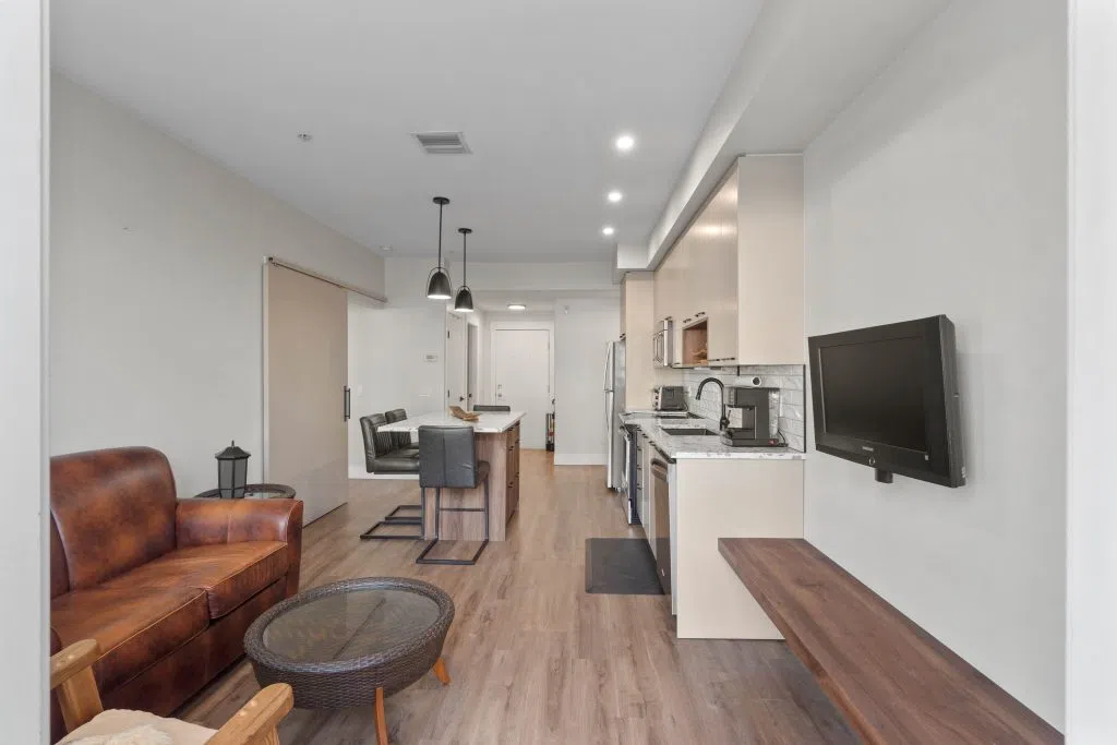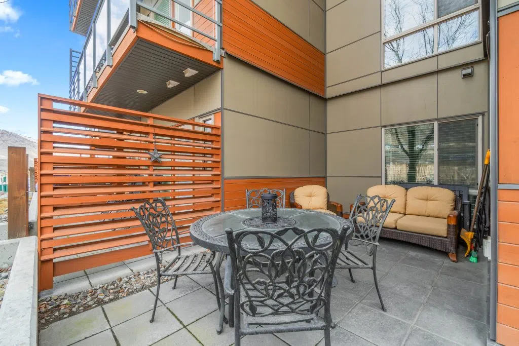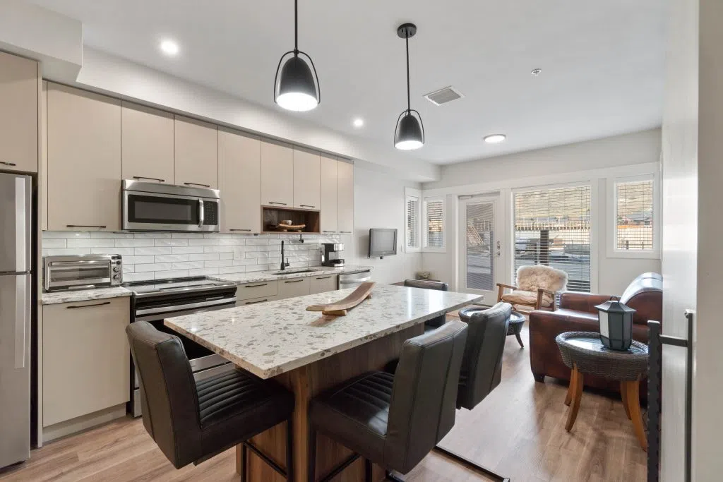 Welcome to the newest Talasa building – Paloma. This beautifully updated 2-bedroom plus den, 1.5-bathroom home offers modern finishes, a spacious layout and easy access to the Sun Rivers amenities and lifestyle. Inside you will find stylish upgrades throughout. Both bathrooms have been refreshed with updated vanities, mirrors, and lighting, while the main bath features a newer tile surround for a contemporary feel. The kitchen is stunning! Showcasing beautiful stone countertops, refinished cabinetry with updated hardware, an undermount black sink with modern faucet, stainless steel appliances, and added pot lighting. A large island with matching stone counter, room to seat 4, and generous drawers provides the perfect space for entertaining, meal prep, or casual dining. Updated flooring runs seamlessly throughout the home. Added lighting creates a bright and welcoming atmosphere. Enjoy indoor-outdoor living with direct access to a spacious patio complete with a private gate to the sidewalk. This layout is ideal for pet owners and those who love the convenience of their own entrance. No need to pass through common space, making this home especially perfect for dog owners. Larger dogs are welcome! Located within walking distance to restaurants, a coffee shop, and the Bighorn Golf & Country Club. Additional features include secure underground parking and a private storage locker. A great opportunity for low-maintenance living without compromising on style or location.