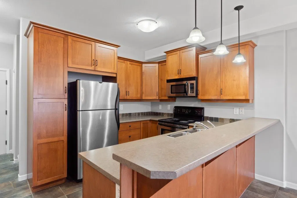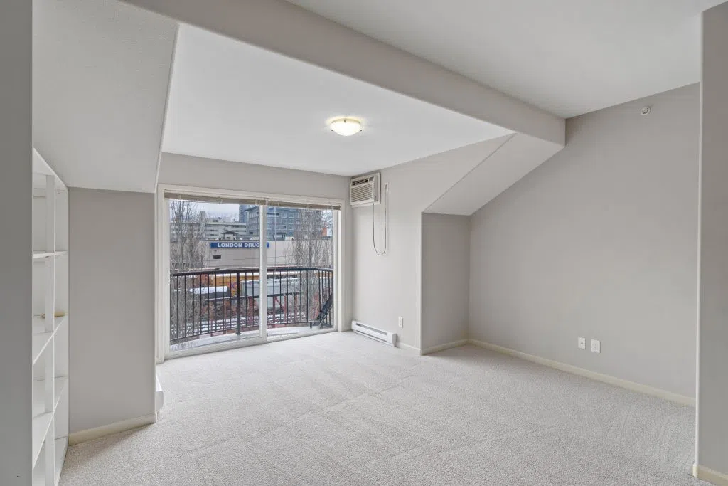 Sophisticated Downtown Loft-Style Apartment — Ideal for Professionals or Downsizers Experience refined urban living in this stylish downtown apartment, featuring a dramatic second-floor loft that serves as your private primary suite complete with a 3-piece ensuite and generous walk-in closet. Fresh paint and brand-new carpeting offer long-term, low-maintenance comfort. Start your mornings on the charming Romeo & Juliette balcony, and enjoy the thoughtful built-ins, including shelving and a cozy nook perfect for a computer station or reading retreat. The main level showcases hard-surface flooring and an open-concept kitchen with breakfast bar & stainless steel appliances included. The inviting living room extends to a covered deck—perfect for outdoor relaxation year-round. A convenient 4-piece main bath and in-suite laundry with added storage (washer/dryer included) add everyday ease. A versatile main-floor bedroom with hard floors makes an ideal guest room or home office. Just steps down the hall, a handy same-floor storage locker provides exceptional convenience. Freshly updated, move-in ready, and priced to sell with quick possession, this home offers unbeatable proximity to shopping, the hospital, the Sandman Centre, and scenic walking trails. A perfect fit for busy professionals, downsizers seeking simplicity, or snowbirds looking for a stylish lock-and-leave home.