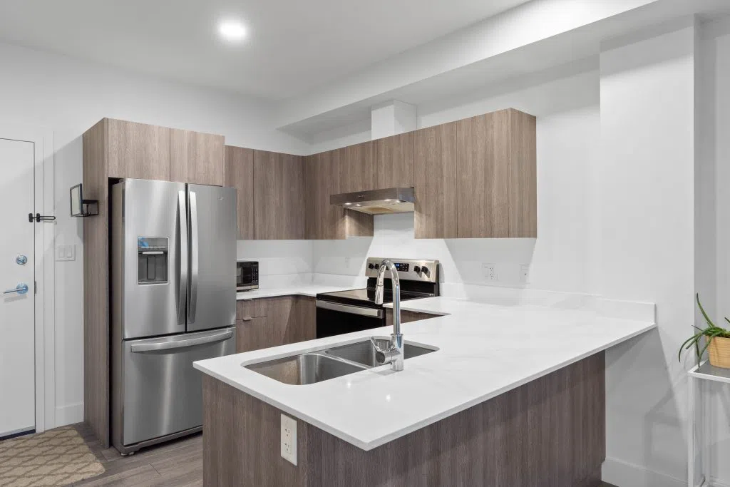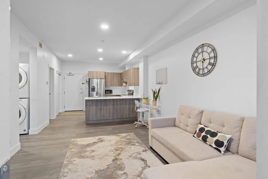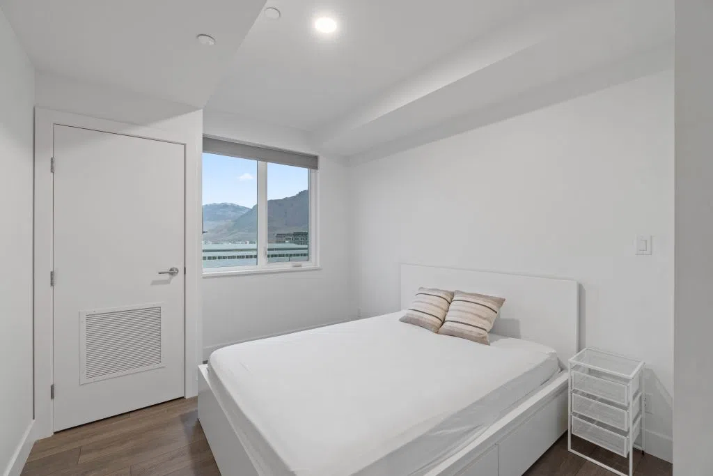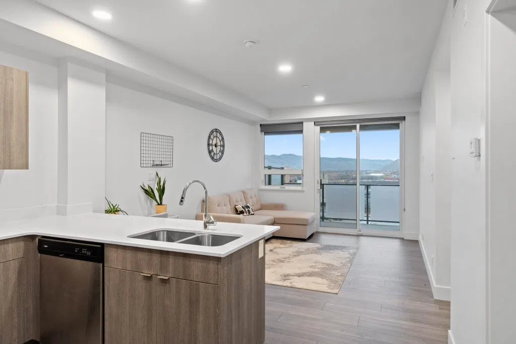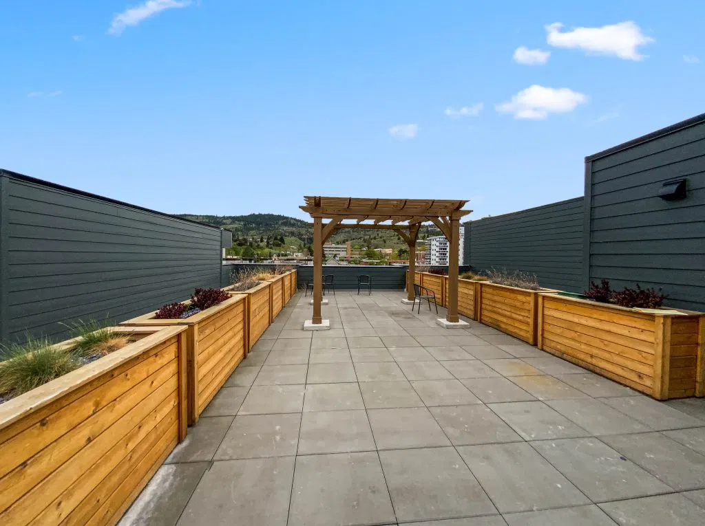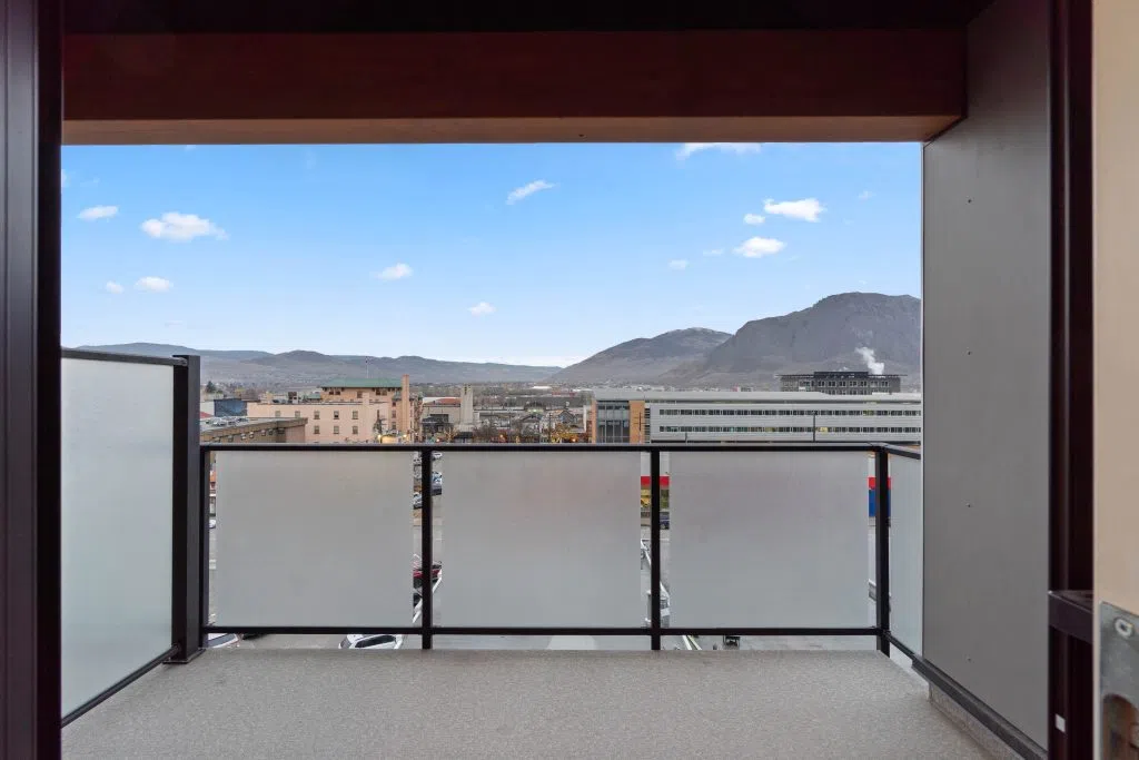 Stunning modern condo with a view! Central location in downtown. Full north view of downtown and the mountains. 4 years old and under warranty for the building envelope and foundation. Quick possession is possible – owner/family occupied. Close to parks, transit, entertainment, dining and the weekly seasonal farmer’s market. Featuring 1 bedroom with the view, a full bathroom, plus a spacious den. 9′ ceilings with an open design and quality, easy care flooring. Bright kitchen with quartz counters, stainless appliances, and eating bar. Airy living room with access to the large covered patio overlooking the mountains. In unit laundry. Central heating and air conditioning. Secure storage locker conveniently located on the same floor. 1 underground parking stall. Access to the common roof top patio and common “lightwell” for a little fresh air! Rentals allowed and up to 2 pets.