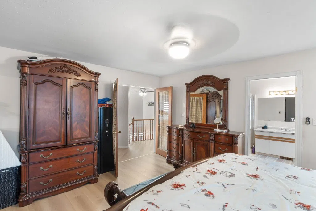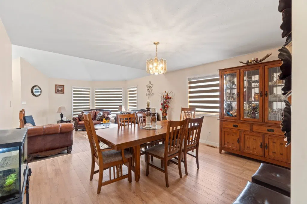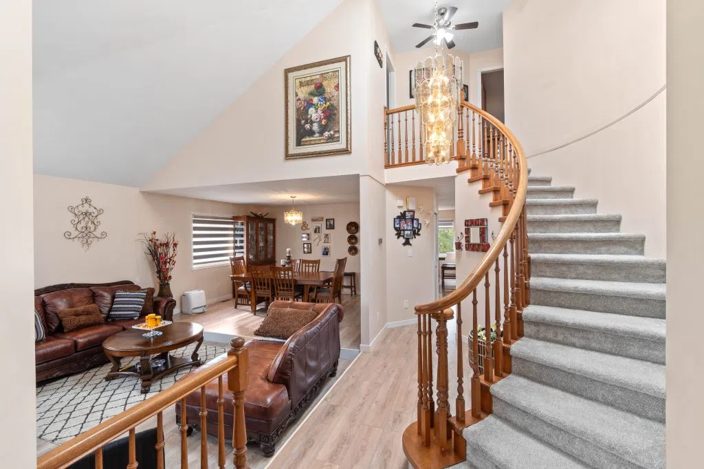 This elegant two-storey executive home combines classic charm with modern comfort—perfectly designed for family living. From the moment you arrive, the home’s impressive street appeal and manicured landscaping set the tone for what’s inside. With a double garage, RV parking, and extra driveway space, there’s room for everyone and everything. Step into the welcoming foyer where an elegant curved staircase leads to the upper level. The sunken living room and formal dining area feature easy-care laminate flooring—ideal for both everyday living and stylish entertaining. The spacious kitchen, with natural light from a vaulted skylight, boasts newer stainless-steel appliances and brand-new quartz countertops being installed—creating a perfect space for family meals and gatherings. The adjoining family dining area overlooks a cozy sunken family room with a gas fireplace and patio doors opening onto a covered BBQ deck. The private, fenced backyard has underground sprinklers and mature fruit trees and backs on a daycare. A handy stairwell from the yard offers outside access to the unfinished basement, perfect for extra storage or your future development ideas. Two additional bedrooms and a convenient laundry room are located on the main floor. Upstairs, the spacious primary suite features