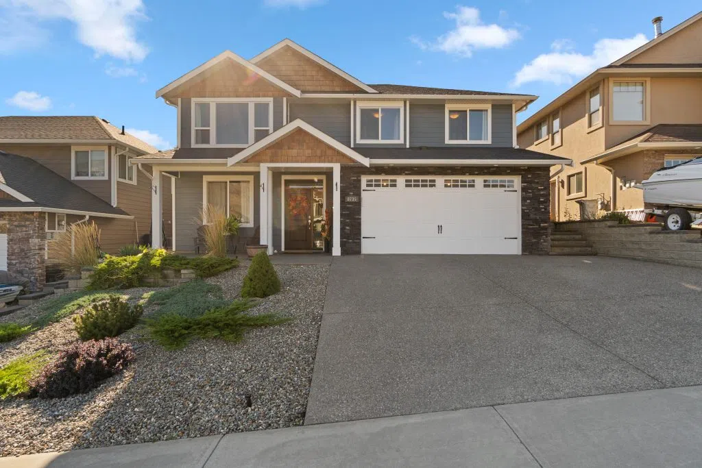 Beautiful family home with great street appeal, xeriscaped front yard & generous 3 car wide driveway for your RV or boat with easy care manual UG sprinklers for the front plantings. Welcoming foyer with front bedroom/office and access to the oversized, heated double garage with tandem bay for a 3rd vehicle or workshop. Upper level features engineered hardwood floors, open concept living with island kitchen with appliances included & lots of cabinets for storage. Spacious living room has gas fireplace & stunning river and mountain vineyard views. Dining area with built-in buffet opens to a private fenced yard with negotiable gazebo — perfect for kids & pets. Three bedrooms up including a spacious primary with 4pc ensuite, double sinks & large shower. Entry level offers a bright bachelor in-law suite with Murphy bed, private entrance & full kitchen with all appliances and full bath — ideal mortgage helper or guest space. New hot water tank, in-house sprinkler system, well maintained & serviced furnace & A/C. Backs onto greenspace with trails & close to neighborhood park — the perfect home for a growing family!