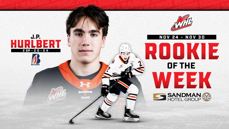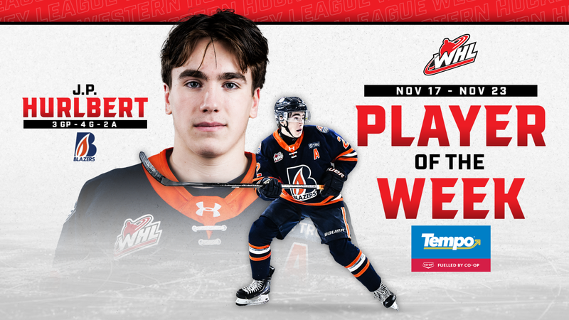 KAMLOOPS - Kamloops Blazers forward JP Hurlbert has been named the WHL's Player of the Week for the week ending Nov. 23. Hurlbert, the reigning WHL player of the month, is the first repeat winner of the WHL's weekly award this season. He was the WHL's Player of the Week for the week ending Sept. 29, and was also the fi...